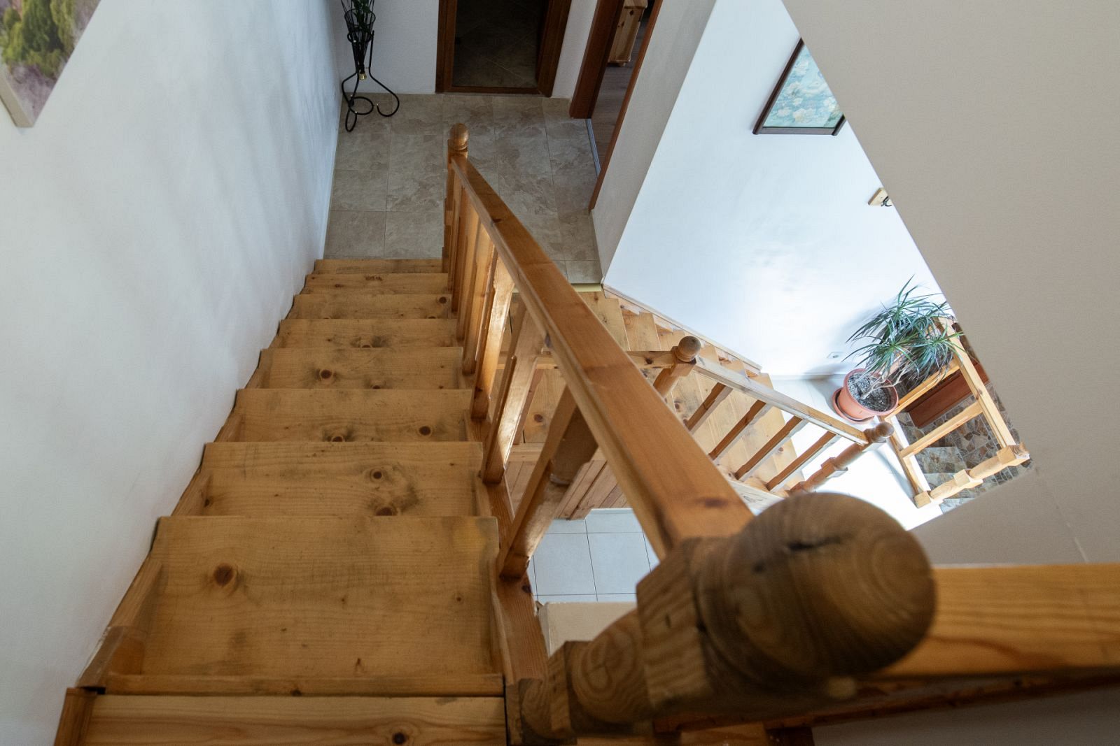 Първият етаж включва: кухня; трапезария-механа; дневна с мека мебел и разтегателен диван за двама; 1 двойна стая; 1 стая за 5 човека; баня с тоалетна; тоалетна.