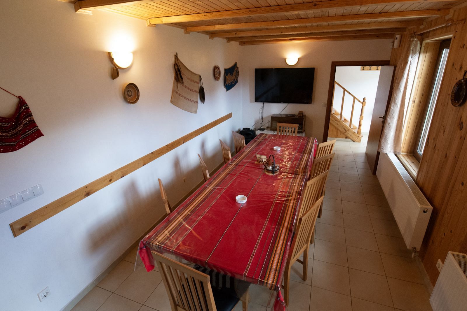 Трапезарията е просторна и разполага с маса и столове за 14 души.