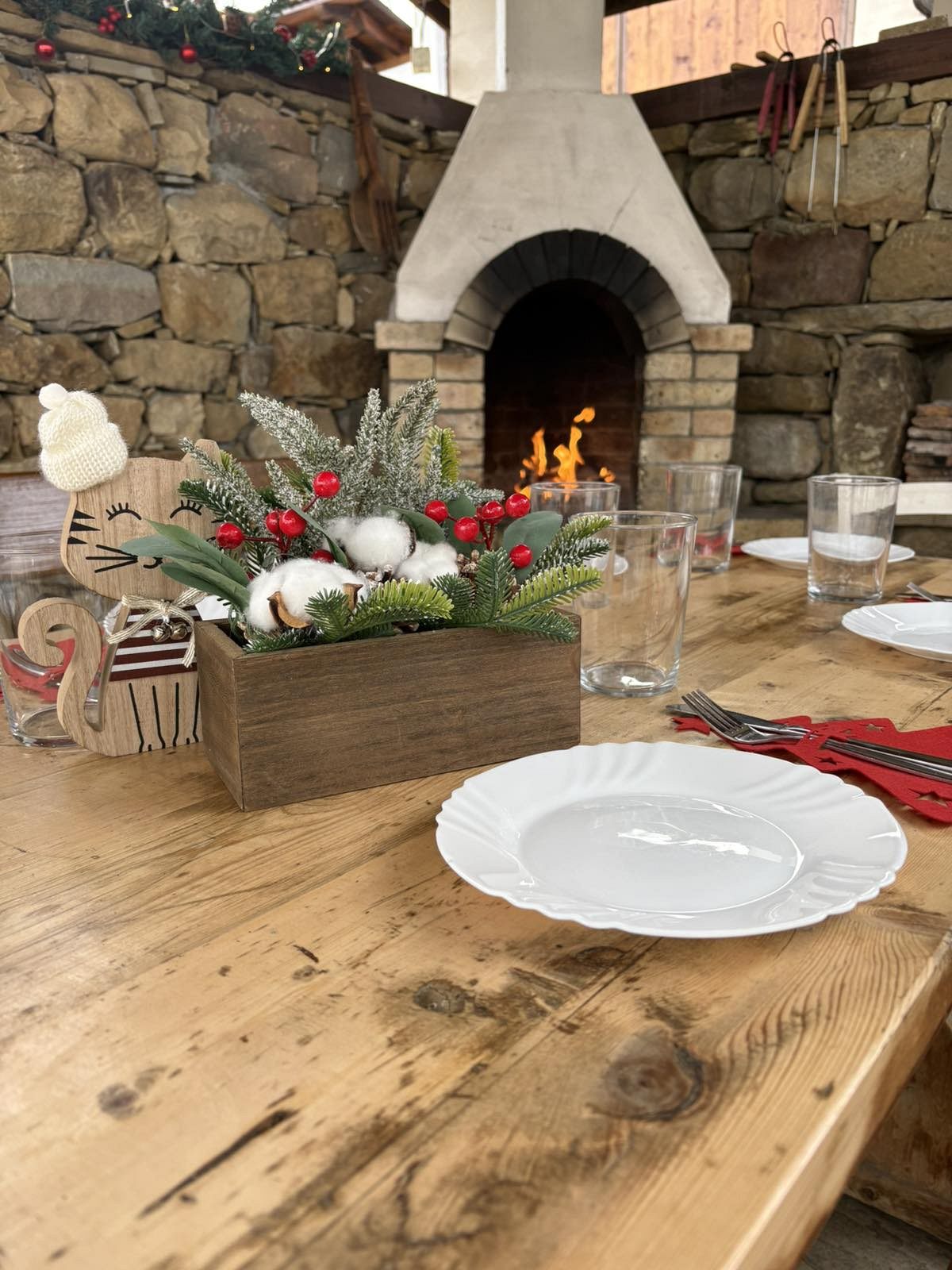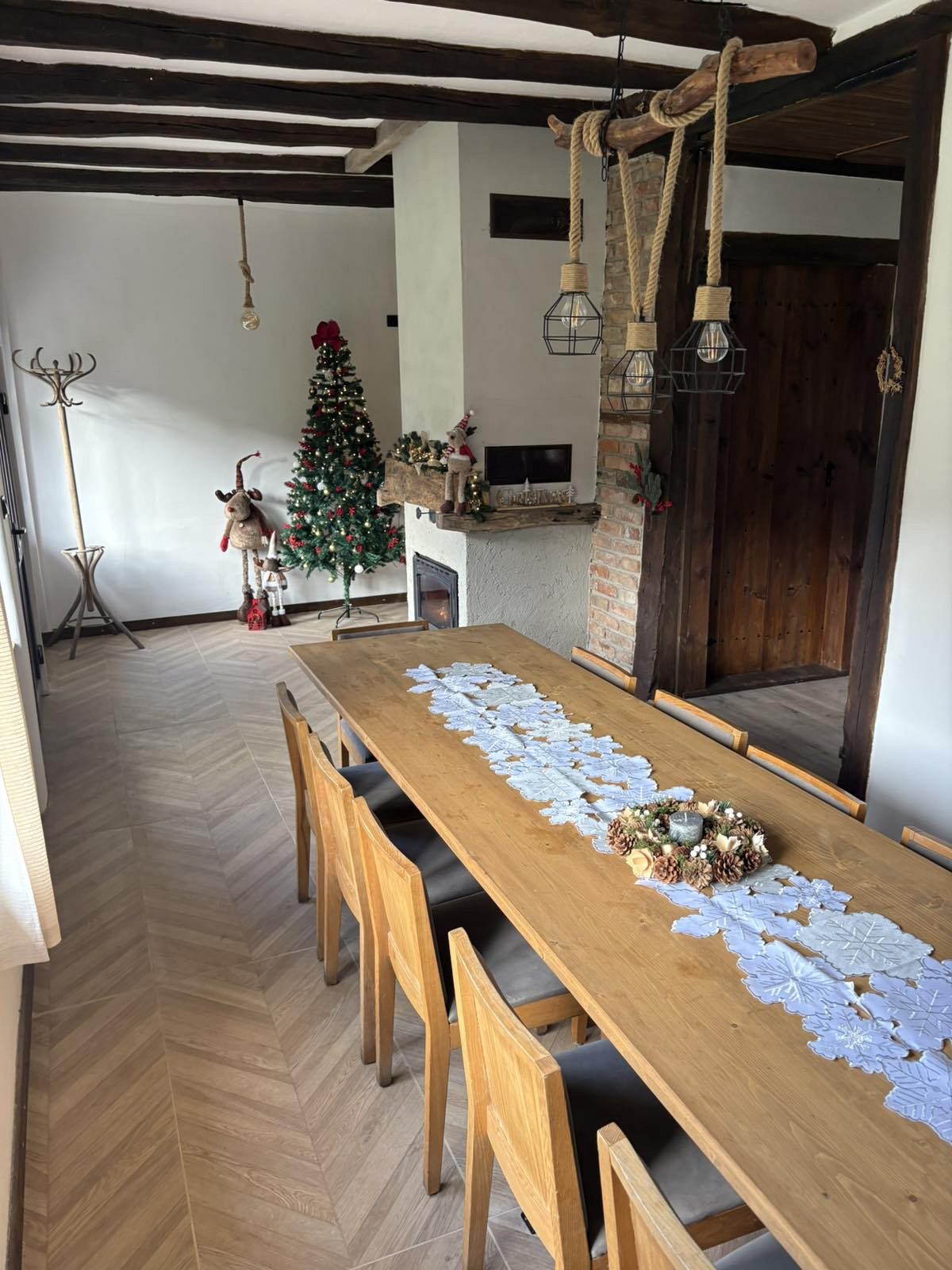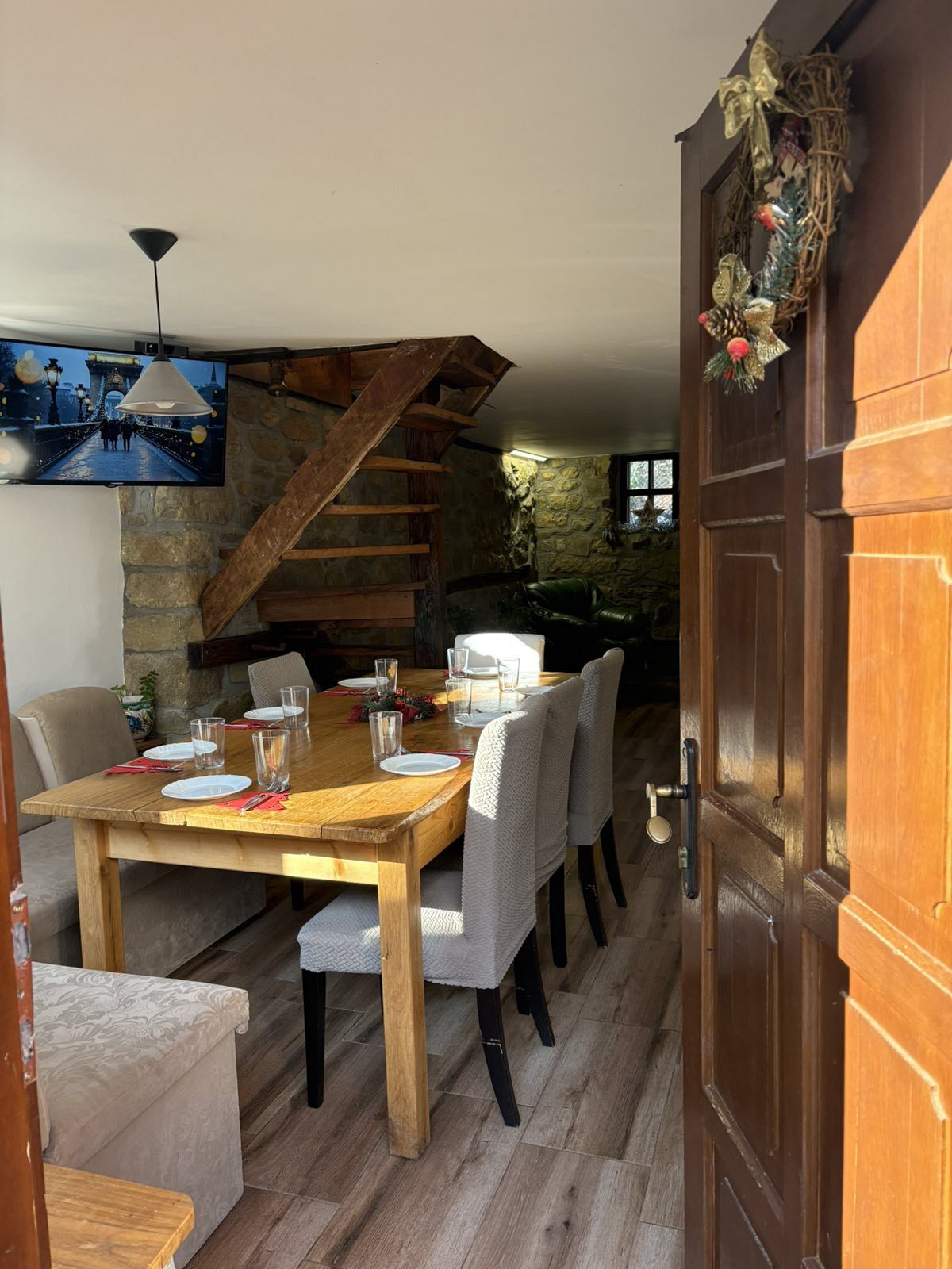 Малка къща: В тази уютна къщичка има 2 стаи, всяка с двойно легло и разтегателен диван за 1 възрастен или 2 деца; 1 санитарен възел сбаня и тоалетна; напълно оборудван кухненски бокс и голяма трапезария (18 места) с камина, която при наемане на двете къщи едновременно може да се ползва от всички гости. Отоплението през зимните месеци е с камина.