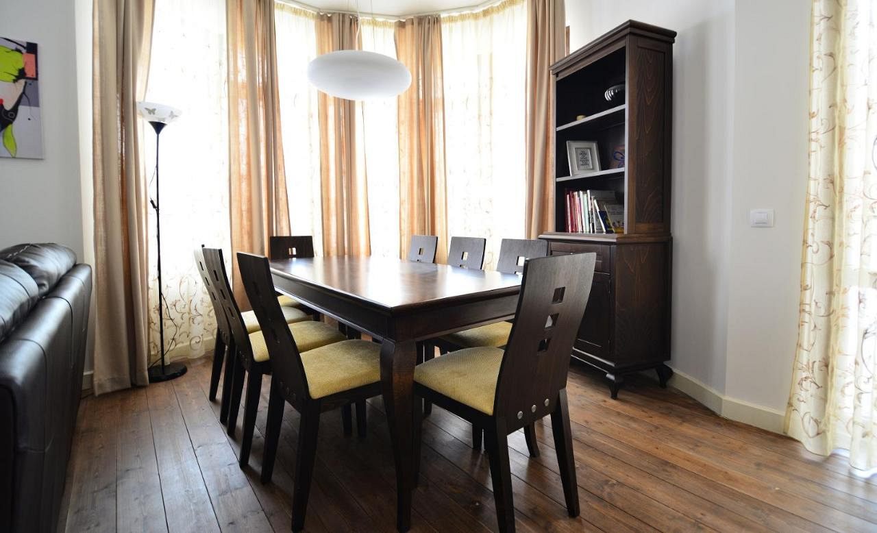 На същия етаж е трапезария с 10 стола и голяма маса за хранене, както и всекидневна с удобна мека мебел, библиотека с книги и настолни игри, 52-инчов телевизор със сателитна телевизия и камина, която създава неповторим уют през студените месеци.