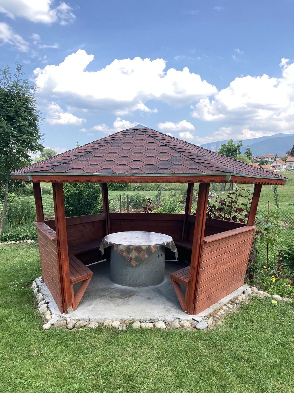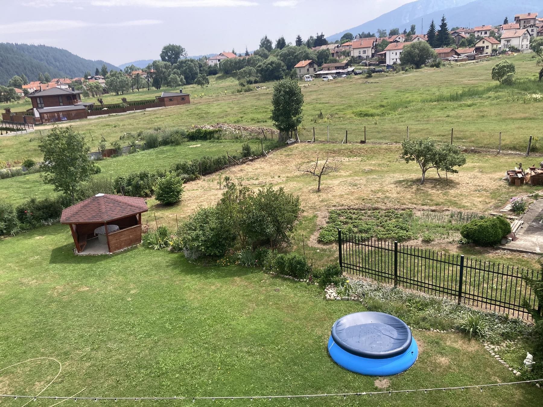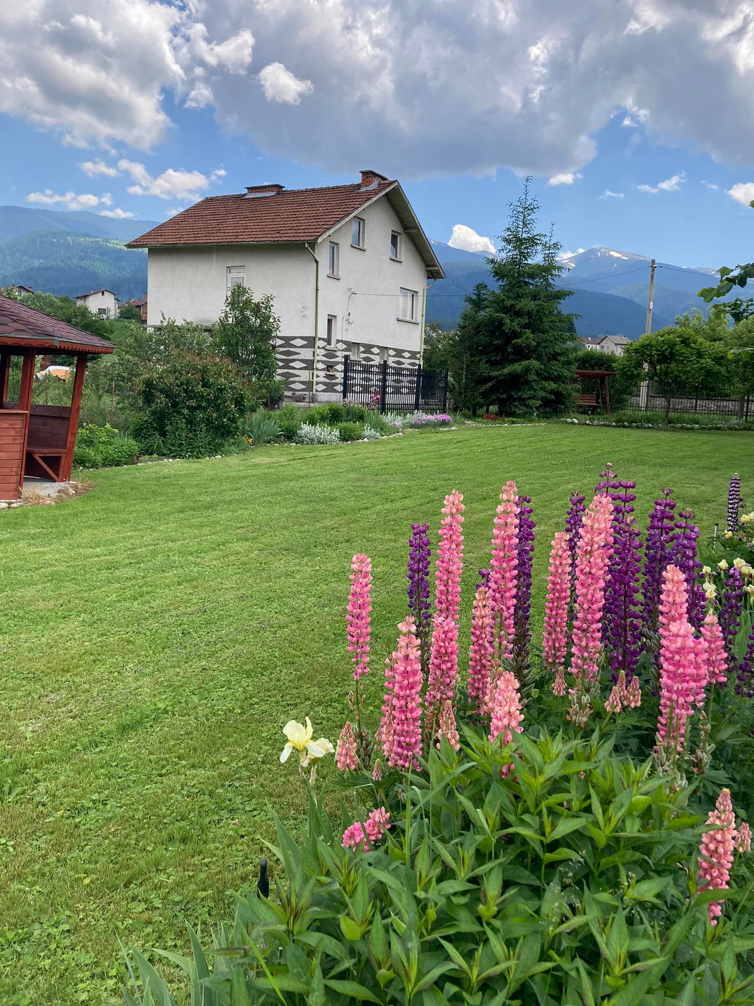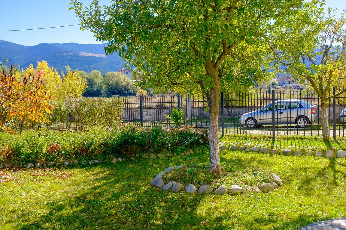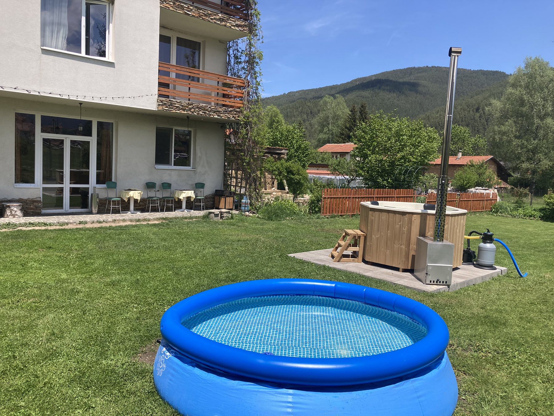 Разполагаме с обширен двор с красиво аранжирана градина, целогодишно външно джакузи на дърва, сезонен басейн, тенис-маса, люлка и кътове за релакс - за всички наши гости, които желаят да се насладят на планинската гледка и чистия планински въздух в комфорта на своето уединение или в компания да ползват външно подвижно барбекю на дървени въглища за изява на кулинарните си умения.