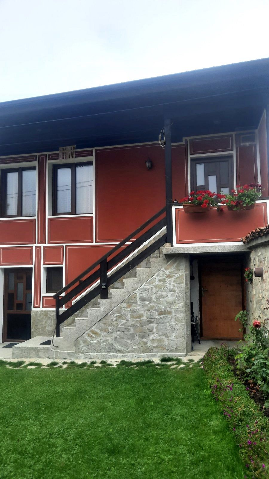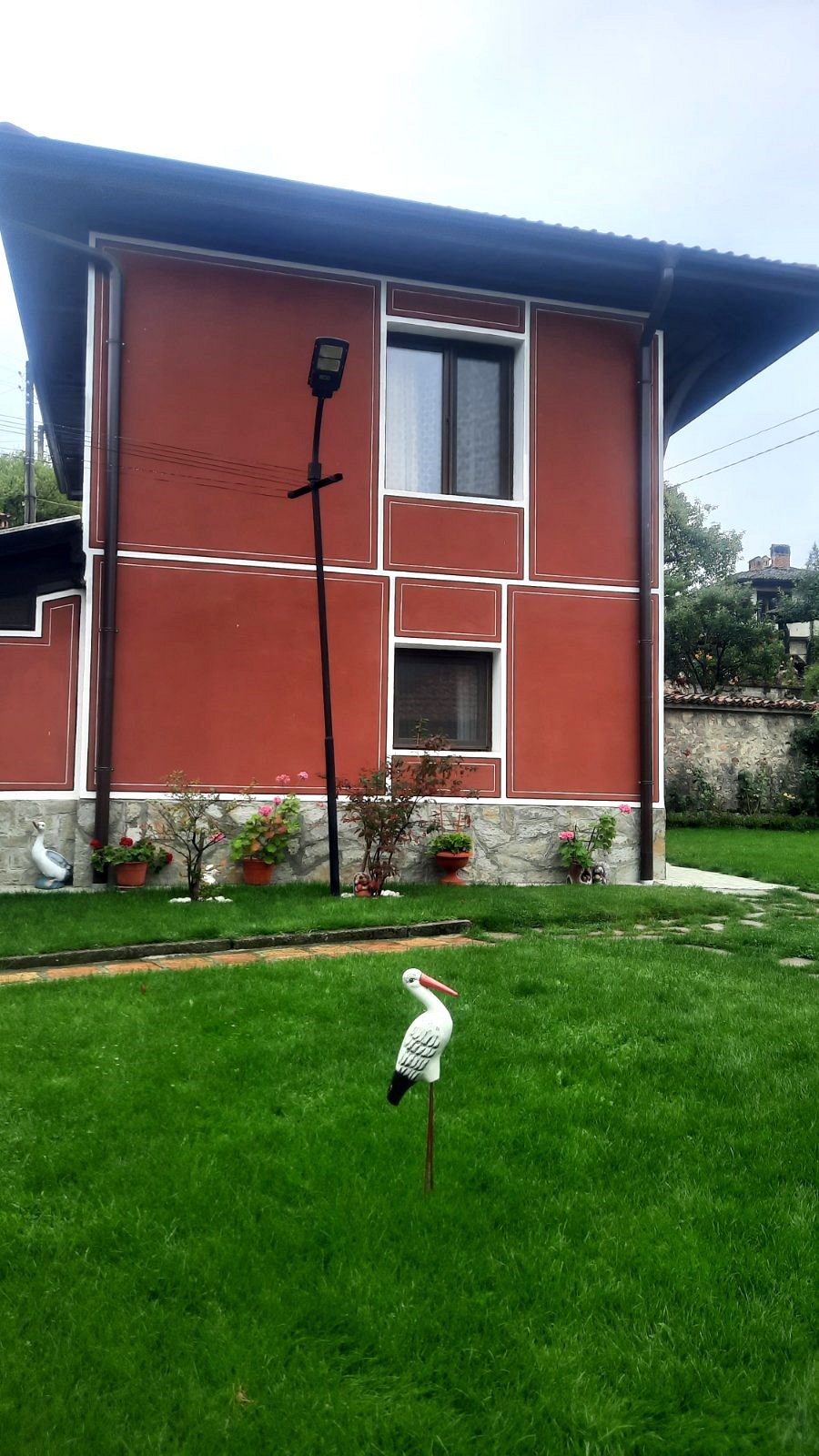 Дворът е просторен, затревен, подходящ за детски игри.