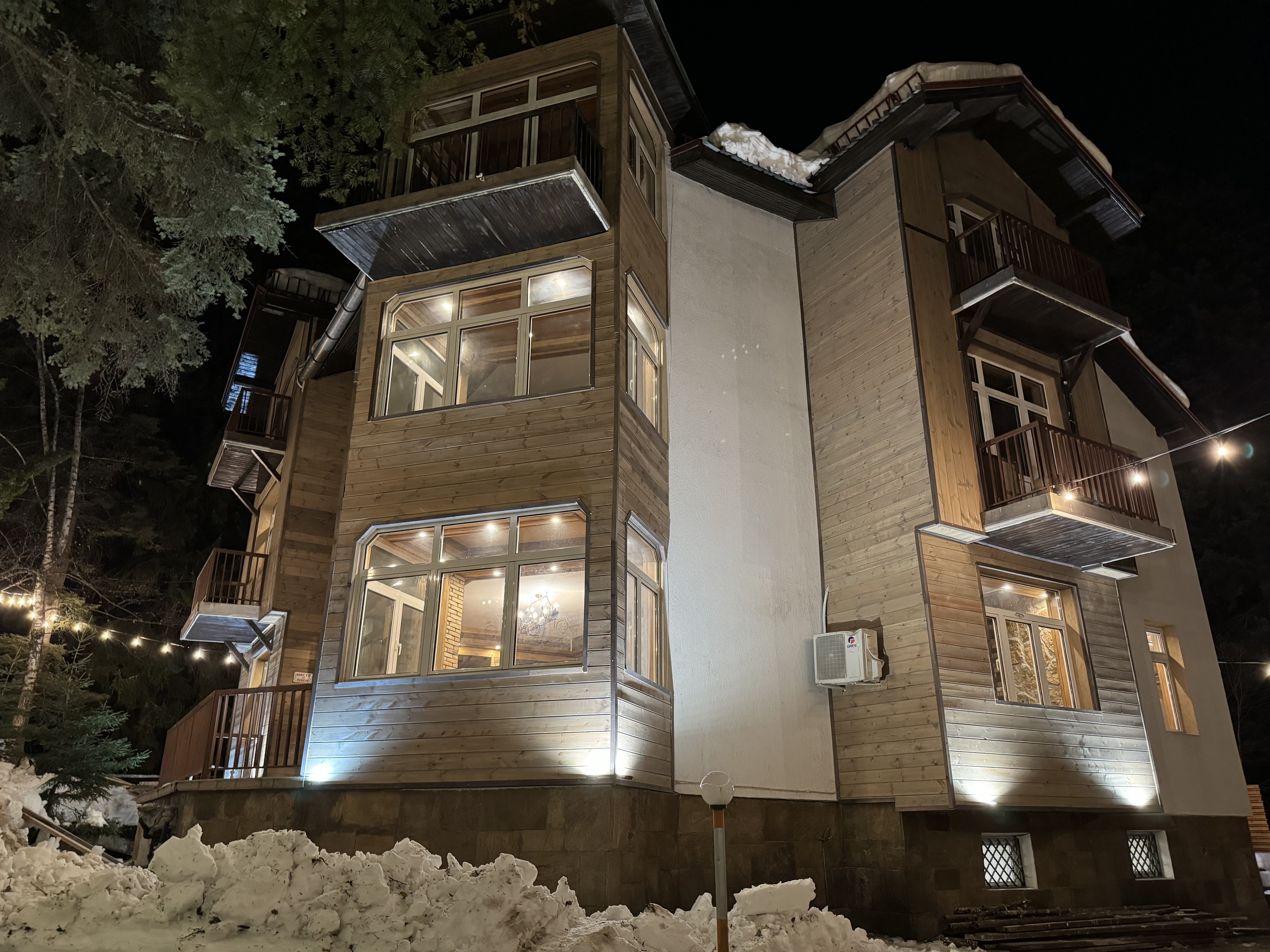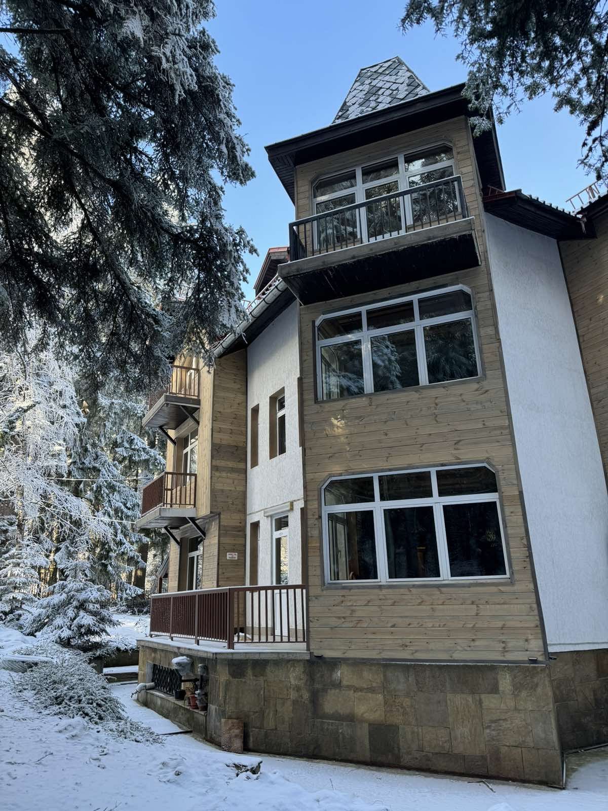Вилата е триетажна къща, с автентичен алпийски дизайн, с голям двор от 2000 кв м.