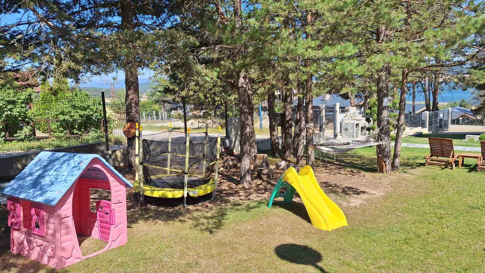 Освен това Ви предлагаме огромна поляна, подходяща за игри и пикник, къща на дърво с играчки, пясъчник, батути, дартс, баскетболен кош, люлки, хамаци, федербал (бадминтон).
