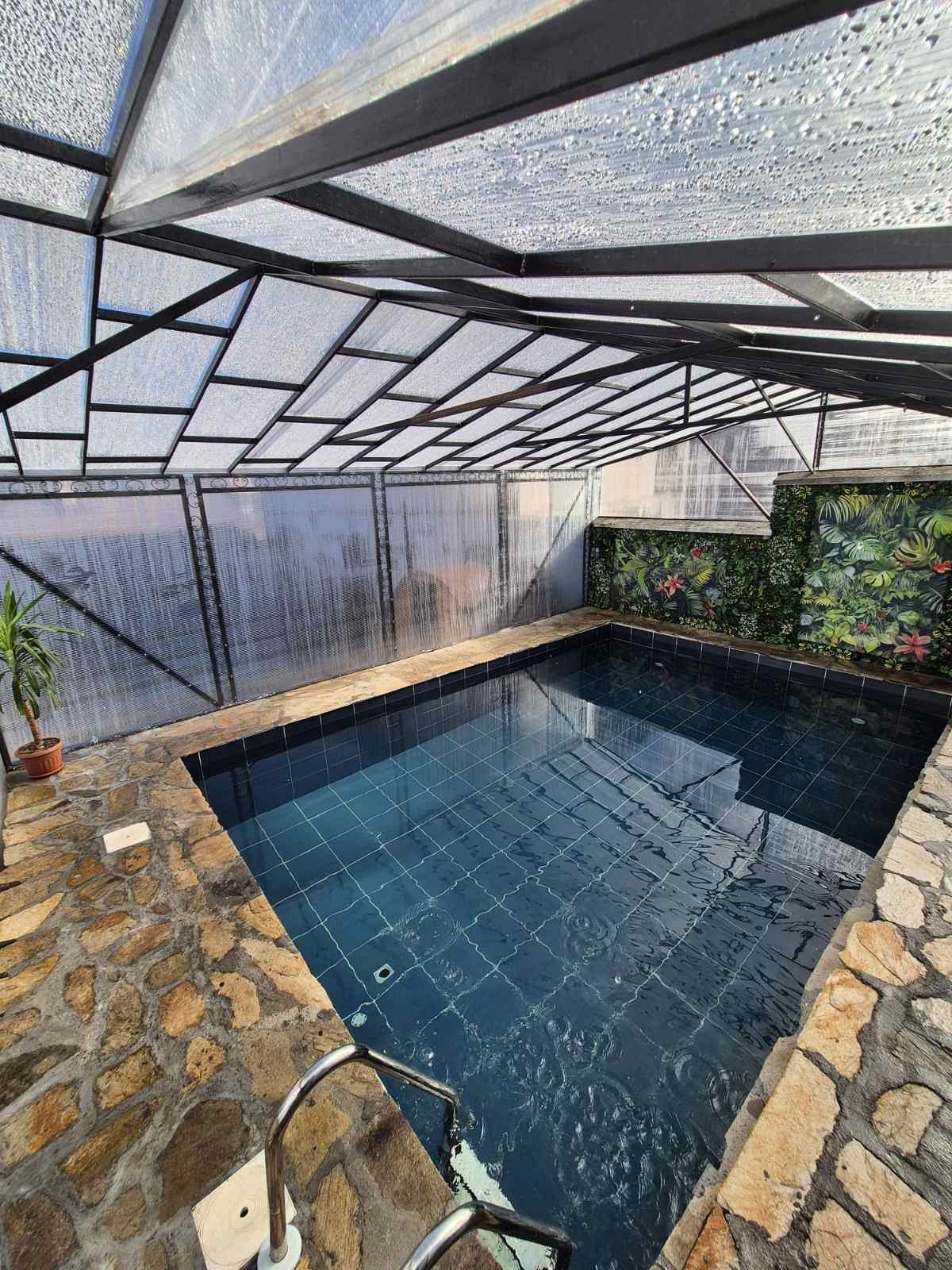 Дворът е кокетно подреден - затревена площ c кът за релакс с шезлонги и кладенче; отопляем вкопан басейн; сауна и джакузи за зимния сезон. Предвидено е допълнително пространство с места за Вашите автомобили.