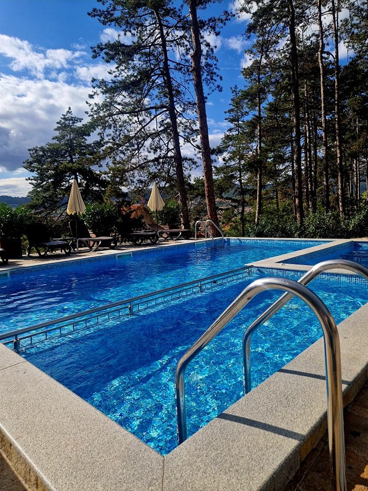 Басейнът и джакузито работят целогодишно, като през летния сезон работното време е от 09:00 ч. до 19:00 ч., а през зимния - от 09:00 ч. до 17:00 ч. В делнични дни, при наемане на обекта от малък брой хора, басейнът не се отоплява. Разполагаме със зона с шезлонги, чадъри и външни душове.