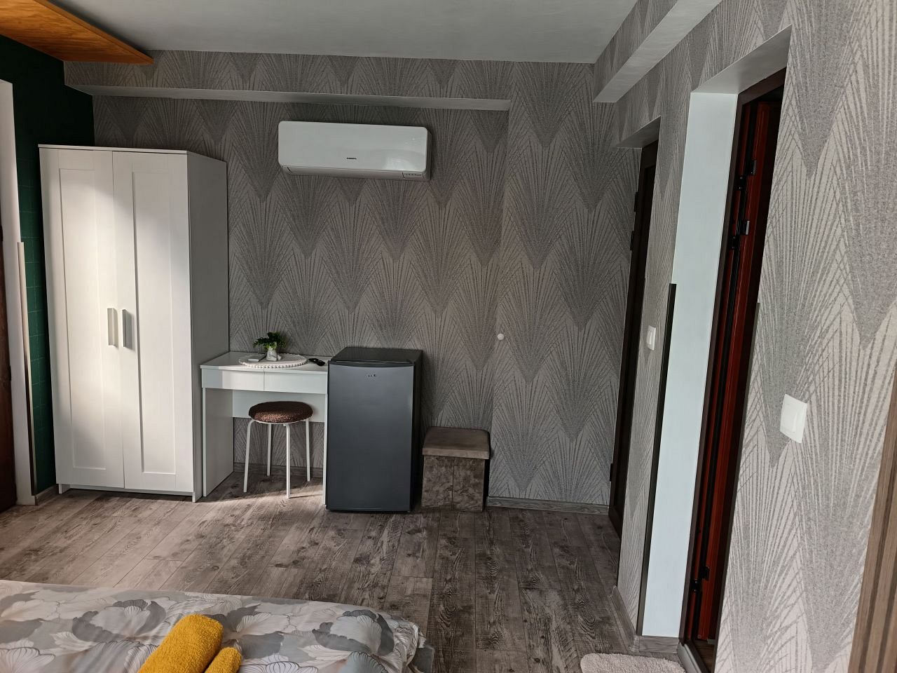 Студиото се намира на партера и има директен излаз към градината. Разполага с двойно легло, разтегателен фотьойл, санитарен възел с баня и тоалетна.