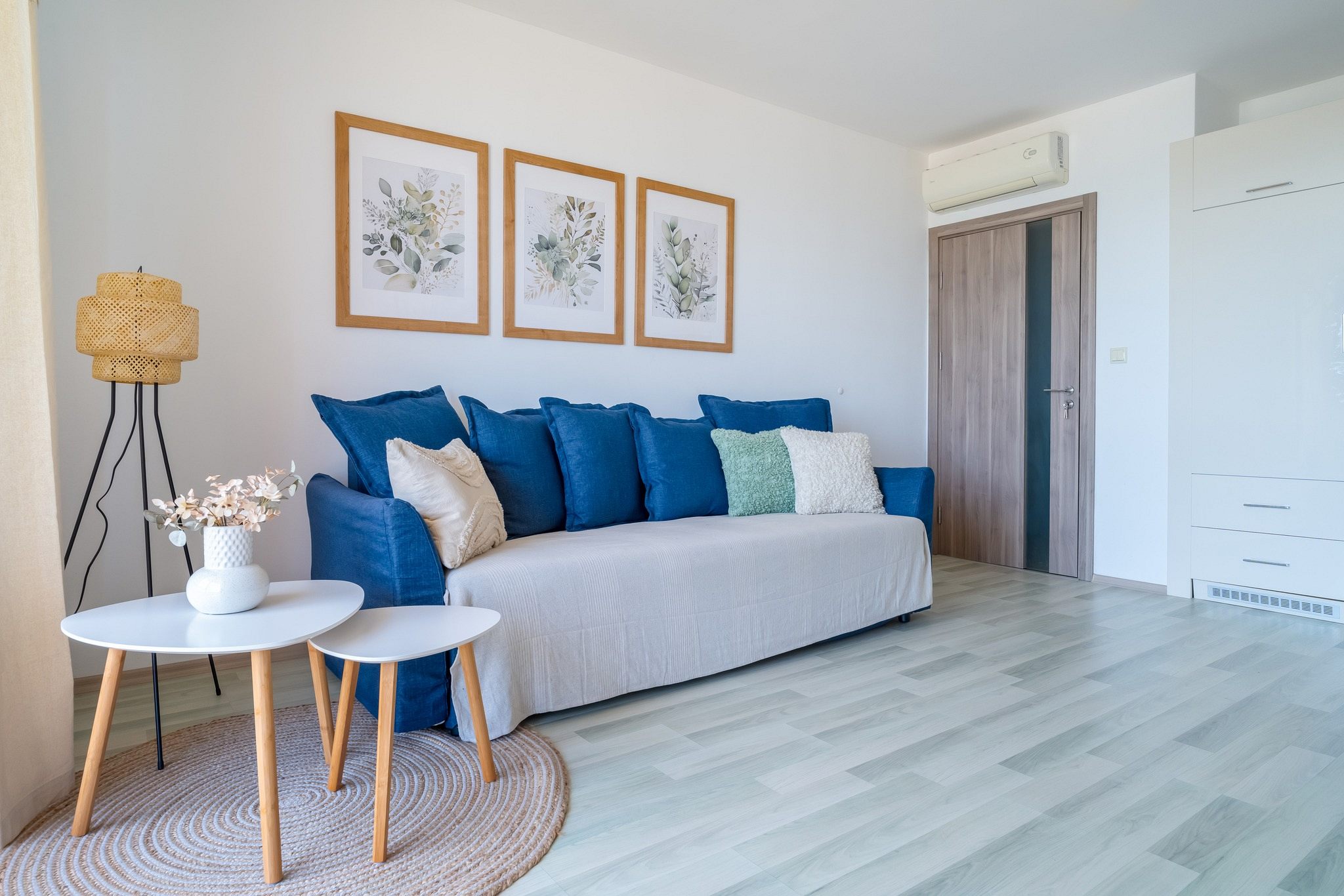 Интериорът е в светли, топли тонове, които отразяват дневната светлина и създават усещане за простор и лекота. Удобствата включват климатик, LCD телевизор със сателитна телевизия, безплатен Wi-Fi интернет, хавлии и сешоар. Кухните са оборудвани с всички необходими уреди - фурна, котлони, аспиратор, съдомиялна, пералня, хладилник, кафемашина с капсули, електрическа кана, посуда и прибори - така, че гостите да се чувстват напълно самостоятелни и уютно настанени.
