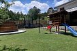 Дворът е просторен, затревен, с чудесен детски кът с къщичка, люлки, пързалка и батут.