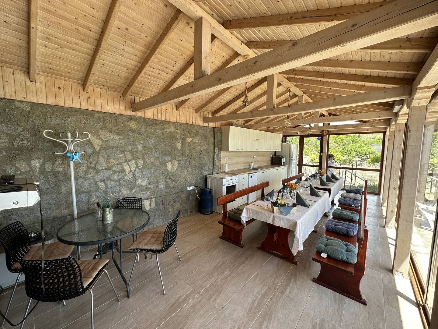 През летния сезон предпочитано място за нашите гости е верандата с просторна открита трапезария и външна кухня с барбекю зона, откъдето се открива красива панорама към морето – перфектни за летни вечери. В басейна с шезлонги около него може да се разхладите през деня.