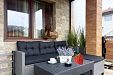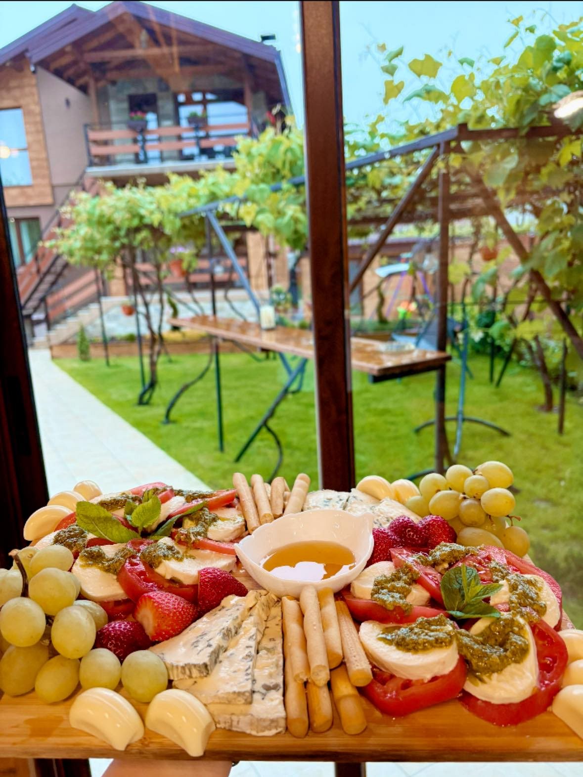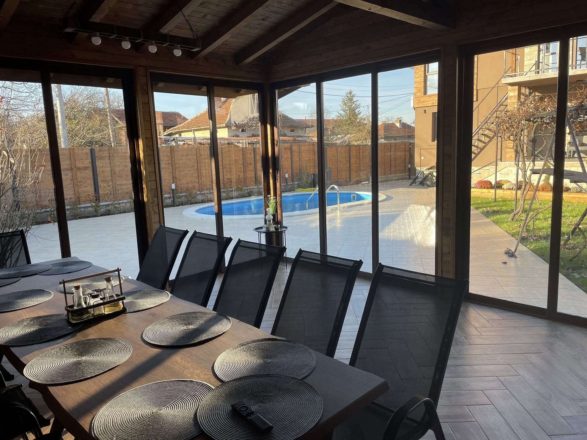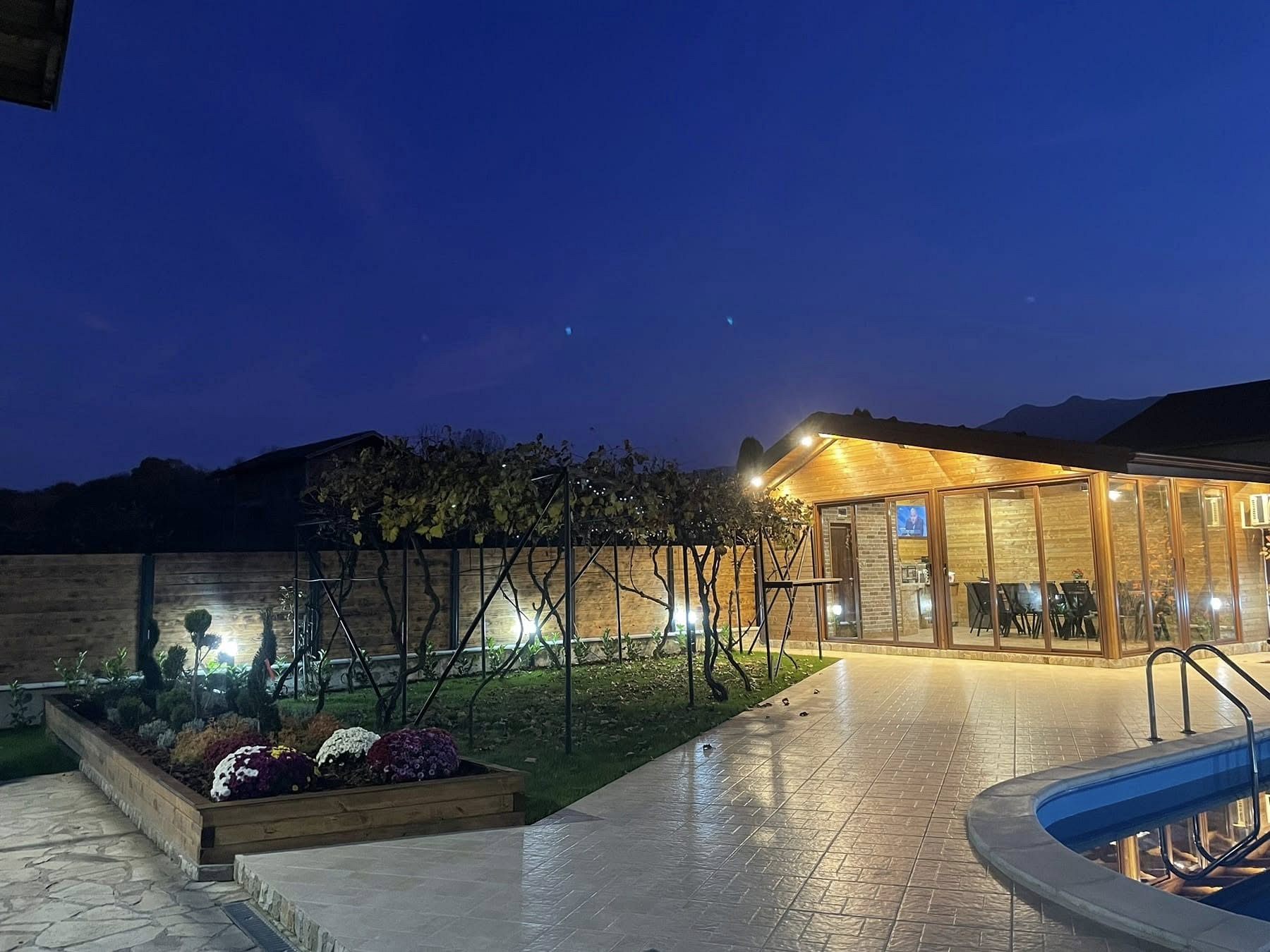 Дворът е просторен, със затревена площ и градина с много цветя; с чудесен детски кът, обособени кътове за релакс и сезонен басейн. На ваше разположение (при допълнително заплащане) са целододишно джакузи и инфрачервена сауна.