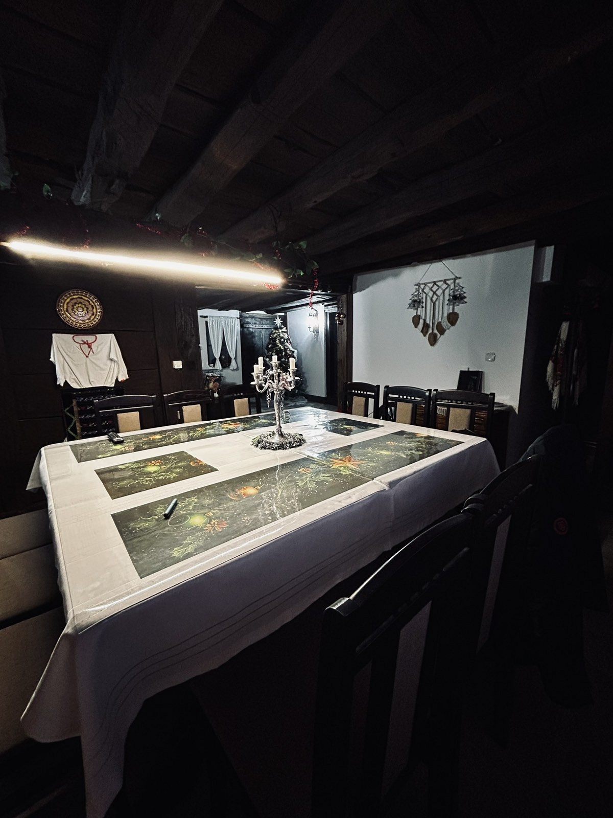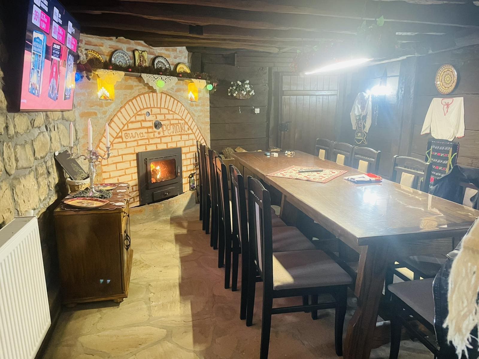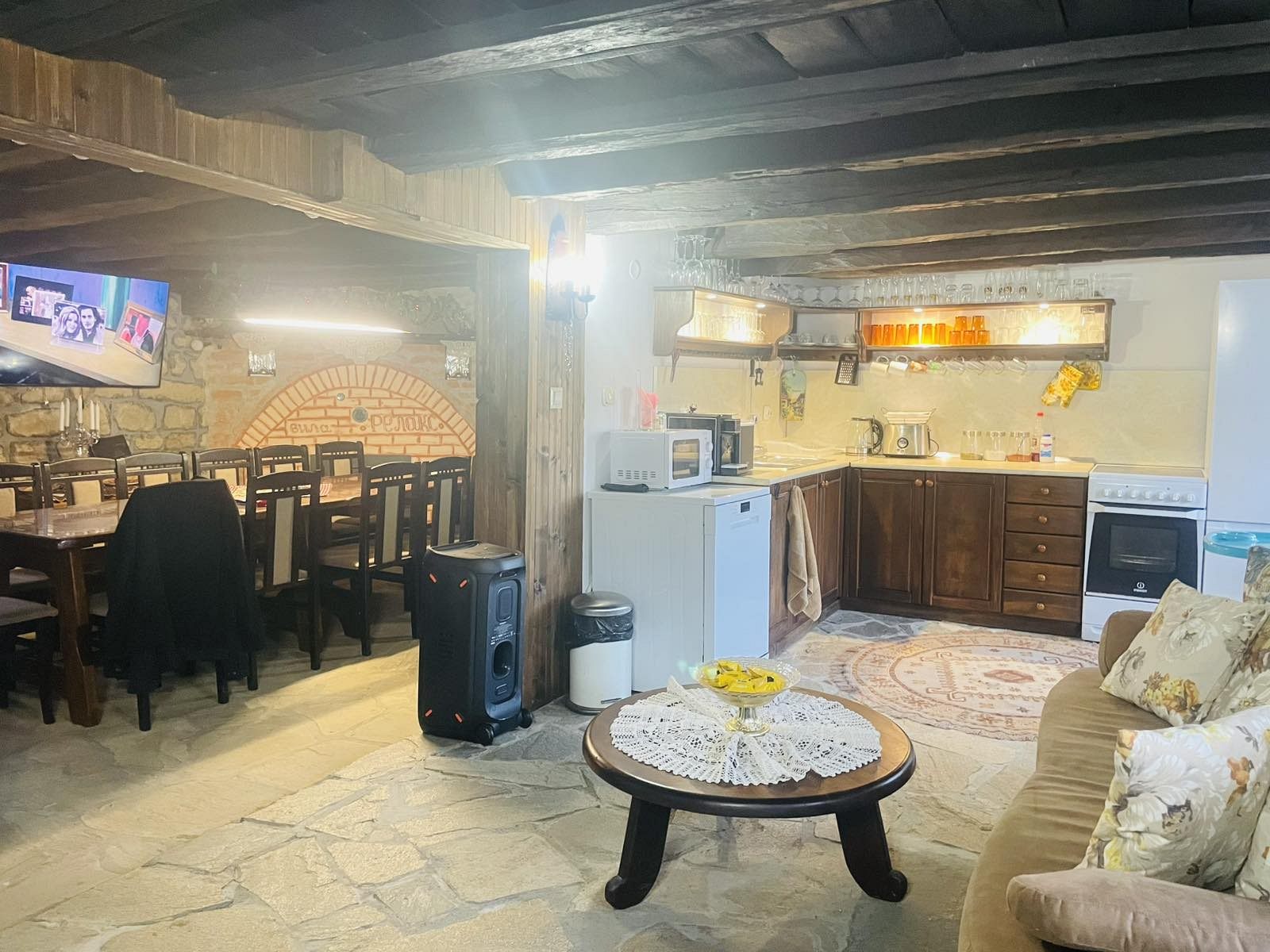 - просторен дневен тракт - трапезария-тип механа с камина и телевизор; кът за сядане с диван, където при необходимост могат да преспят двама гости; напълно оборудвана кухня за самостоятелно приготвяне на храна (вкл. фризер, ледогенератор и кафемашина с капсули Illy). За малките ни гости сме осигурили детско столче за хранене;