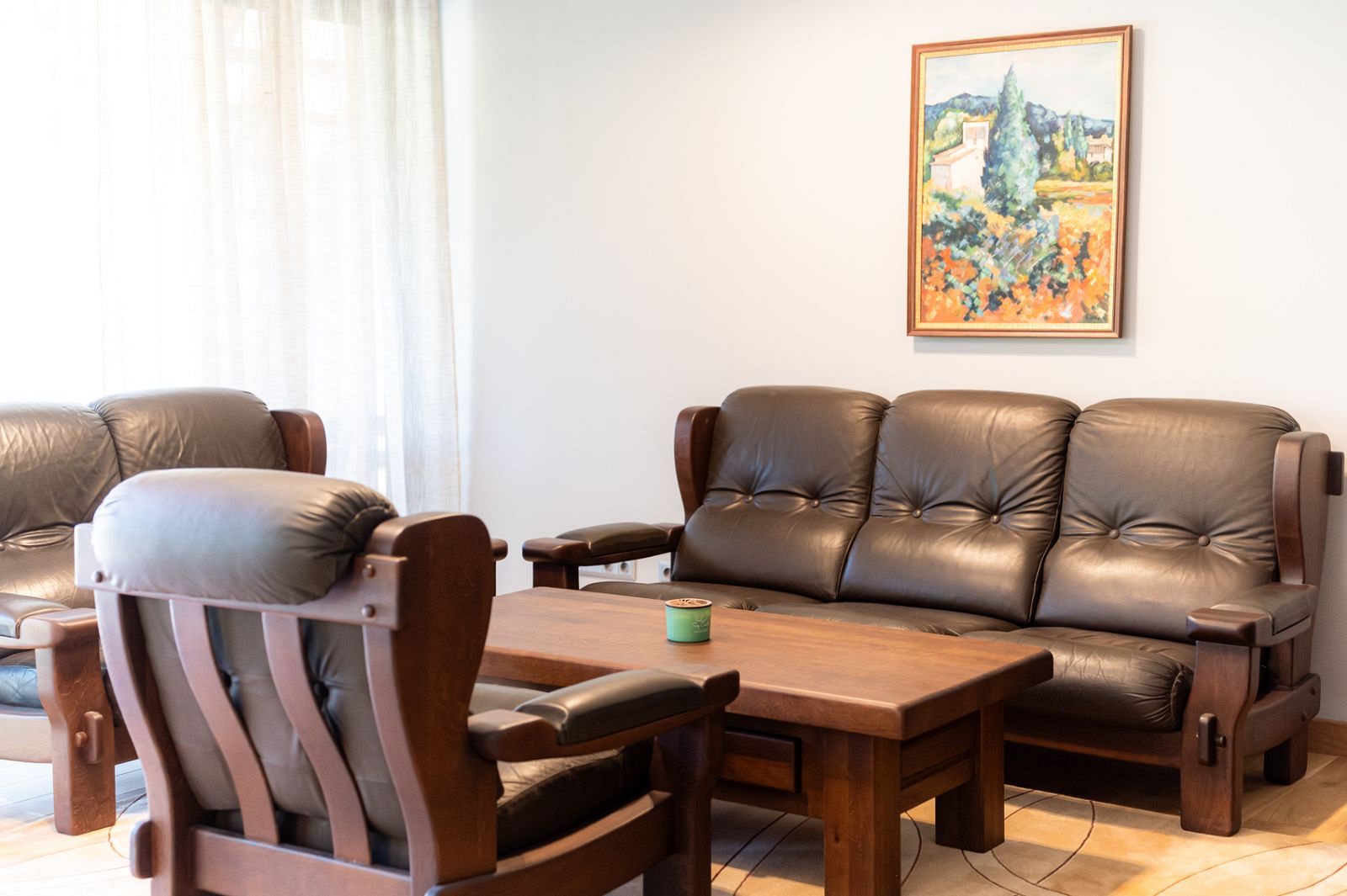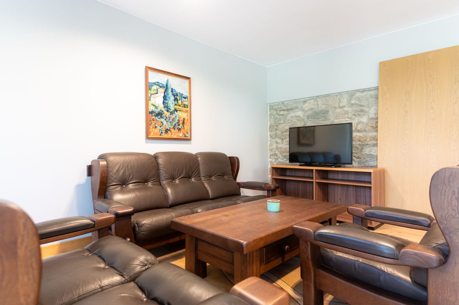 - всекидневна с кожен диван, телевизор, трапезария и кухненски кът;