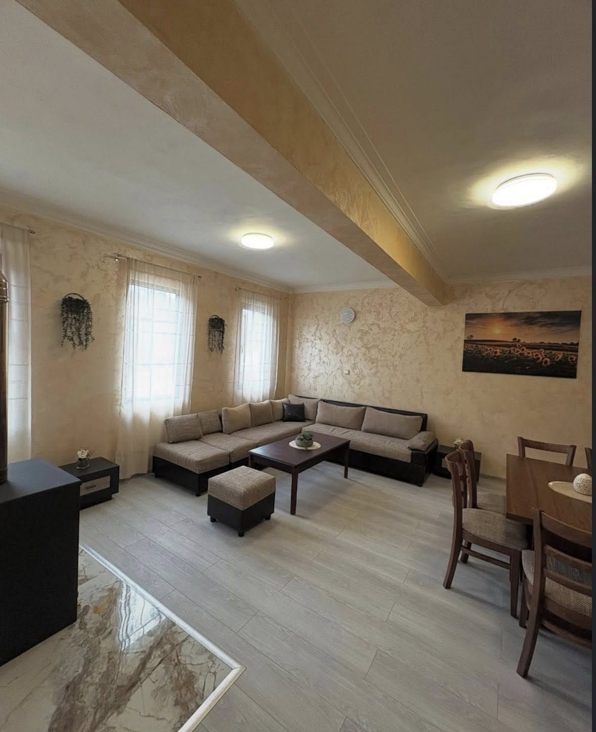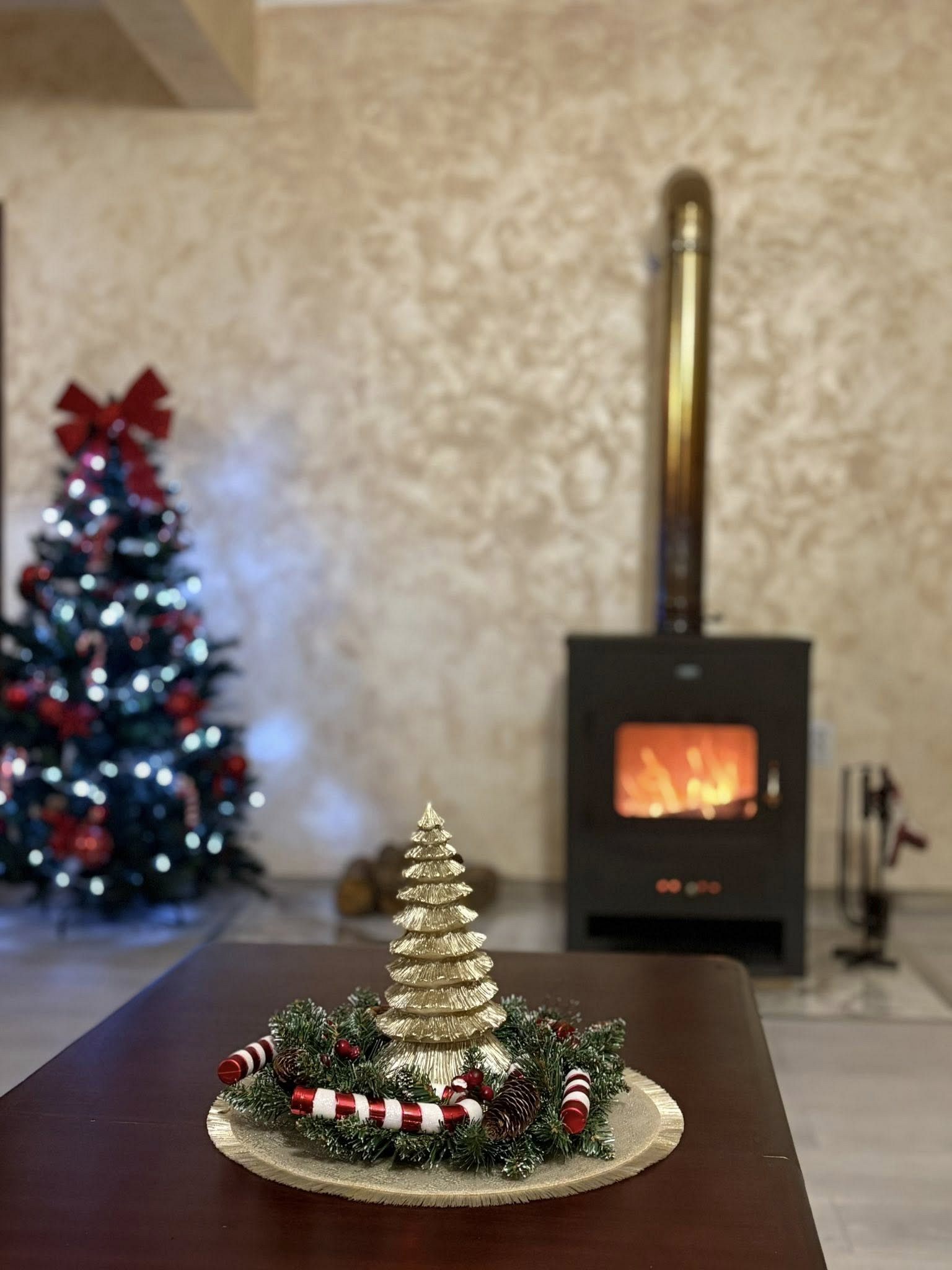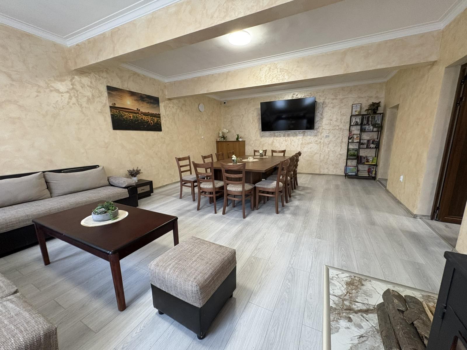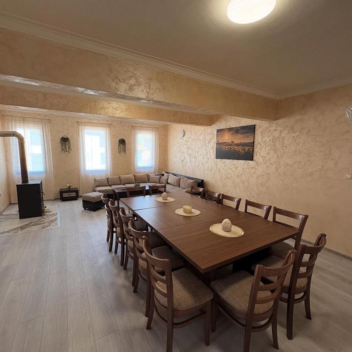- Първи етаж - просторна всекидневна с мека мебел и камина, създаваща неповторим уют през зимните месеци; кът за хранене, подходящ за до 17 гости; напълно оборудвана кухня, в която да приготвите храната си самостоятелно, наслаждавайки се на любимите си домашни рецепти; санитарен възел с тоалетна.