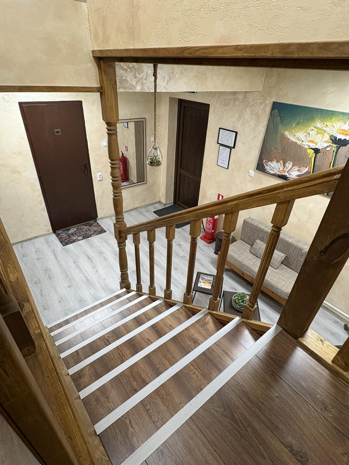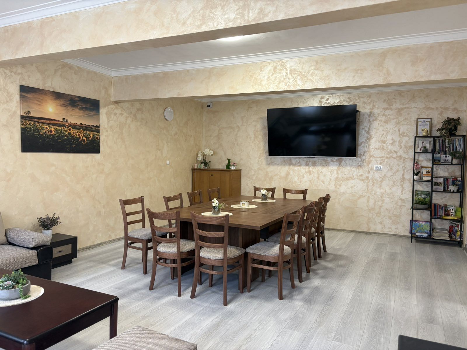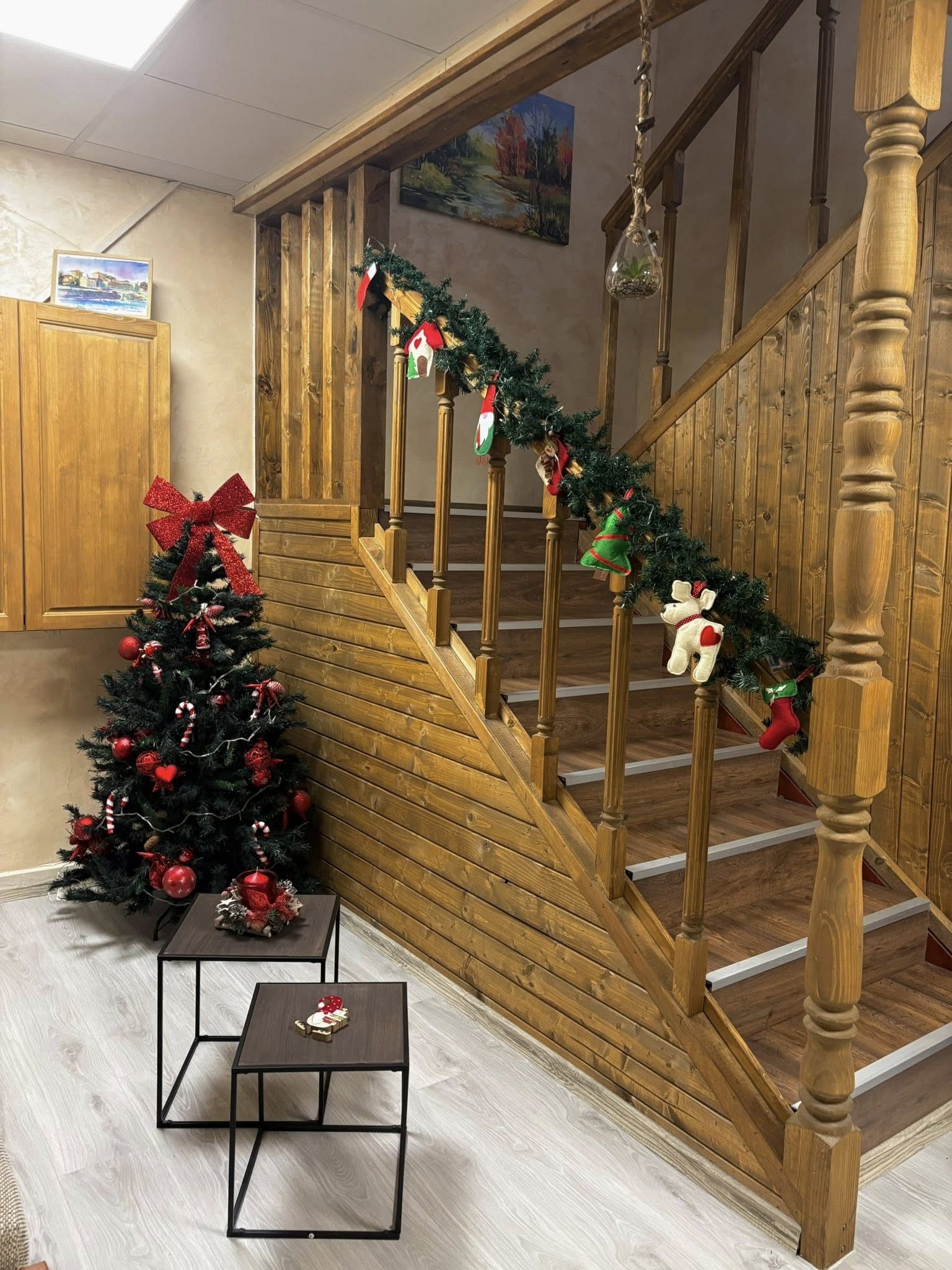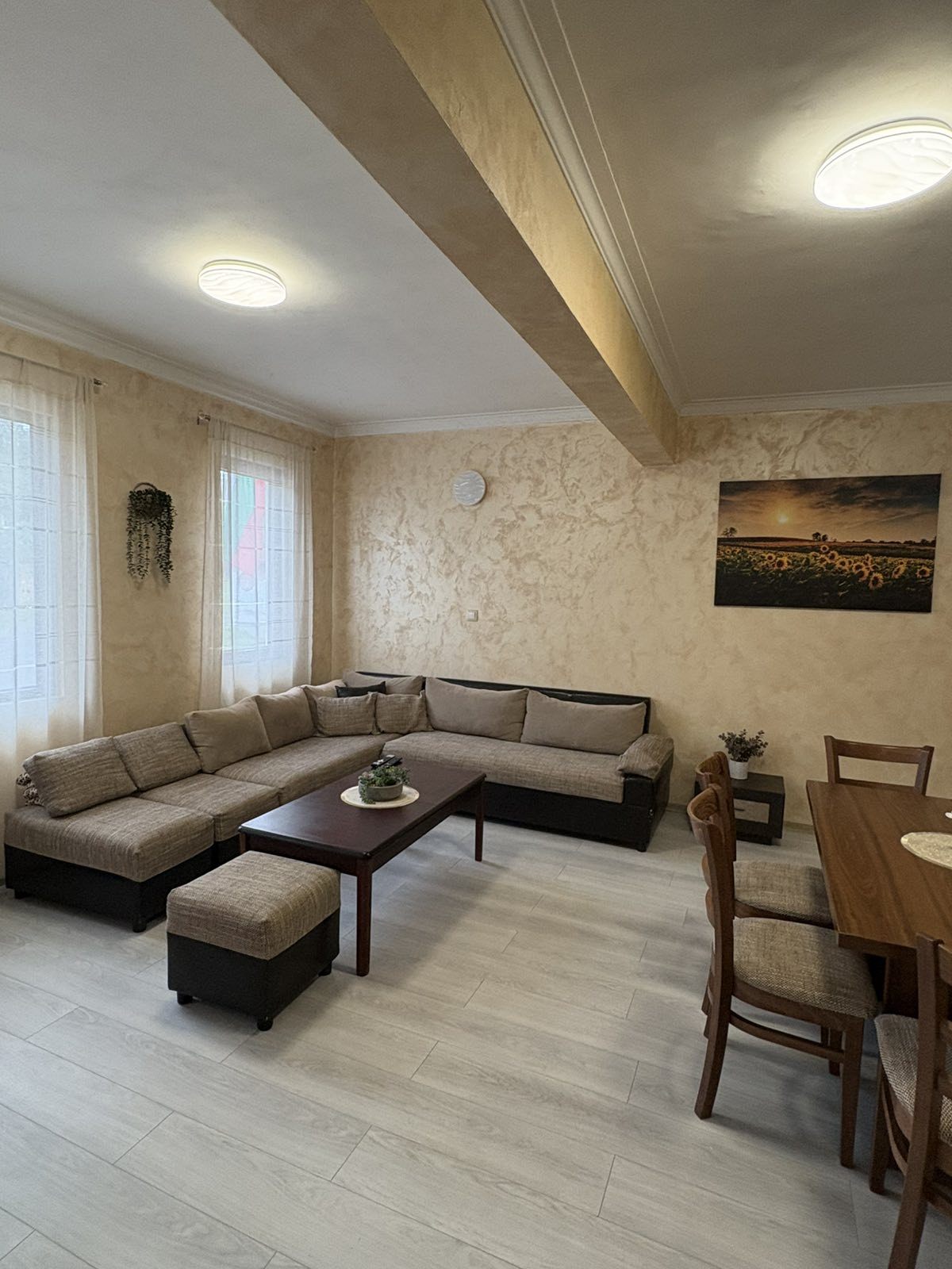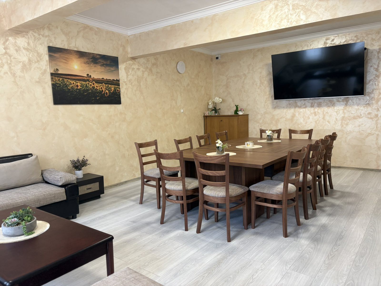 - Първи етаж - просторна всекидневна с мека мебел и камина, създаваща неповторим уют през зимните месеци; кът за хранене, подходящ за до 17 гости; напълно оборудвана кухня, в която да приготвите храната си самостоятелно, наслаждавайки се на любимите си домашни рецепти; санитарен възел с тоалетна.