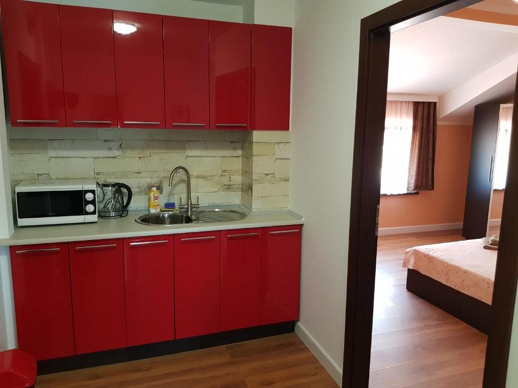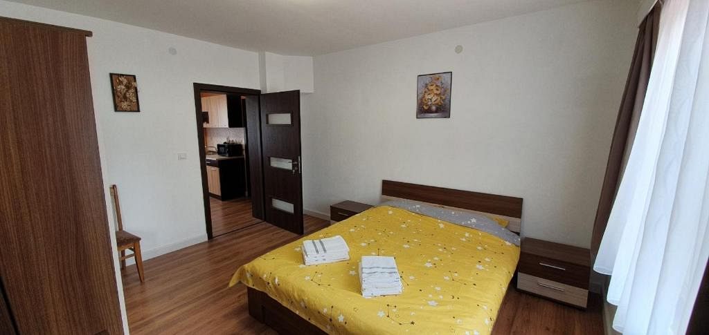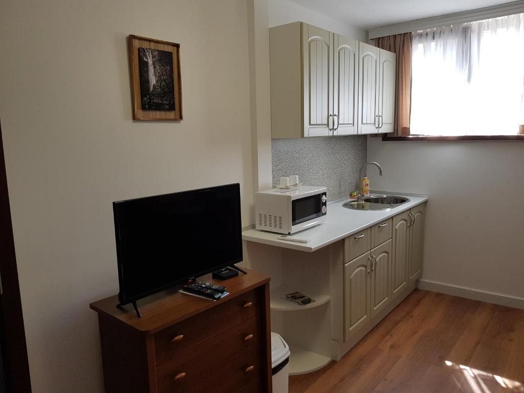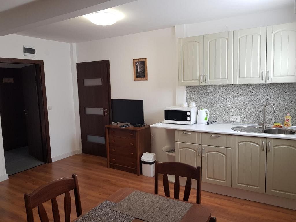 Всеки апартамент включва спалня с двойно легло; дневна с разтегателен диван за двама, телевизор, трапезна маса; кухненски бокс, удобен за приготвяне на закуска - оборудван с хладилник, микровълнова, термокана, посуда (в два от апартаментите има и кана за шварц кафе); към спалнята - санитарен възел с баня и тоалетна. Предоставени са спално бельо, хавлии и принадлежности за баня.