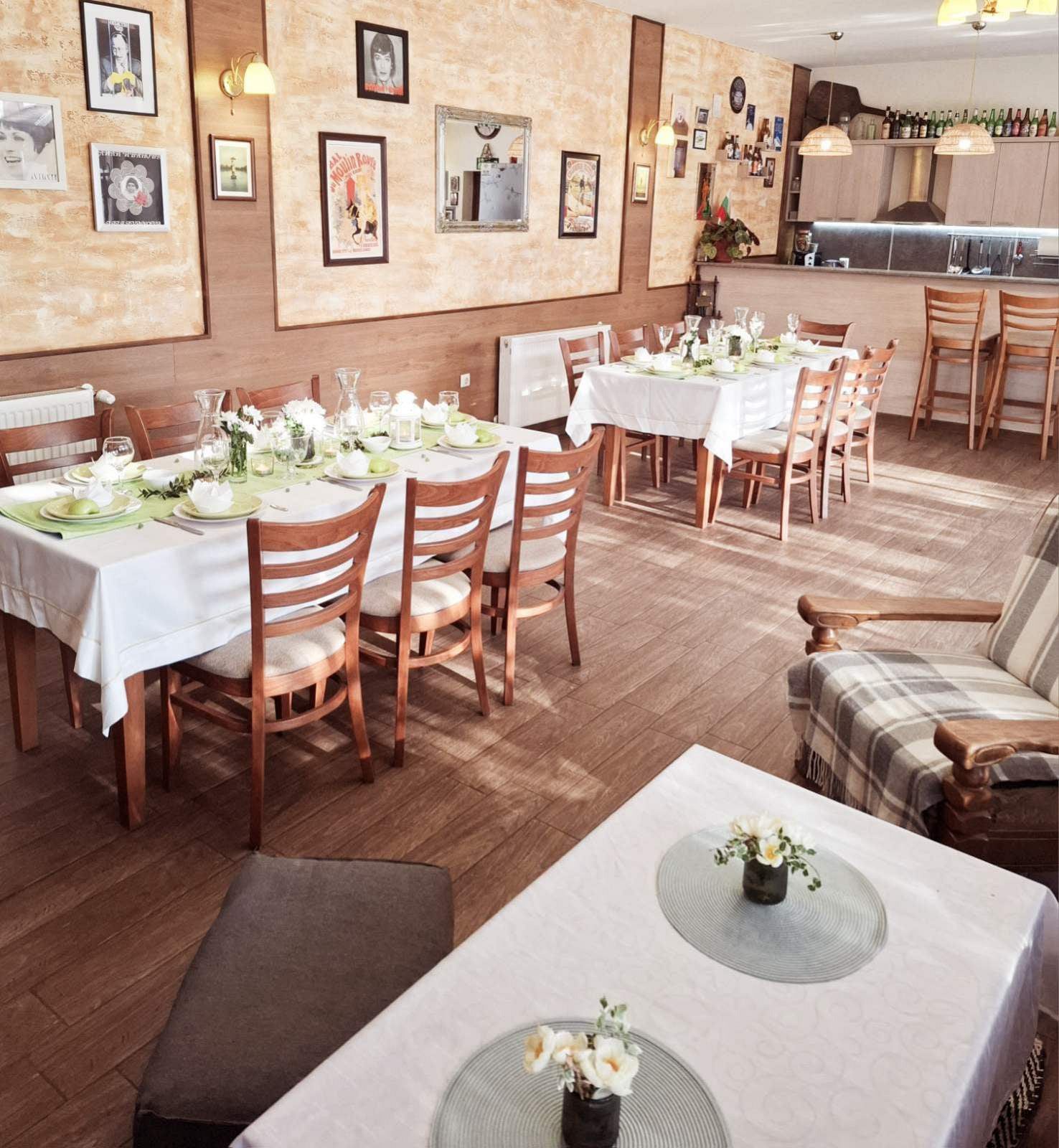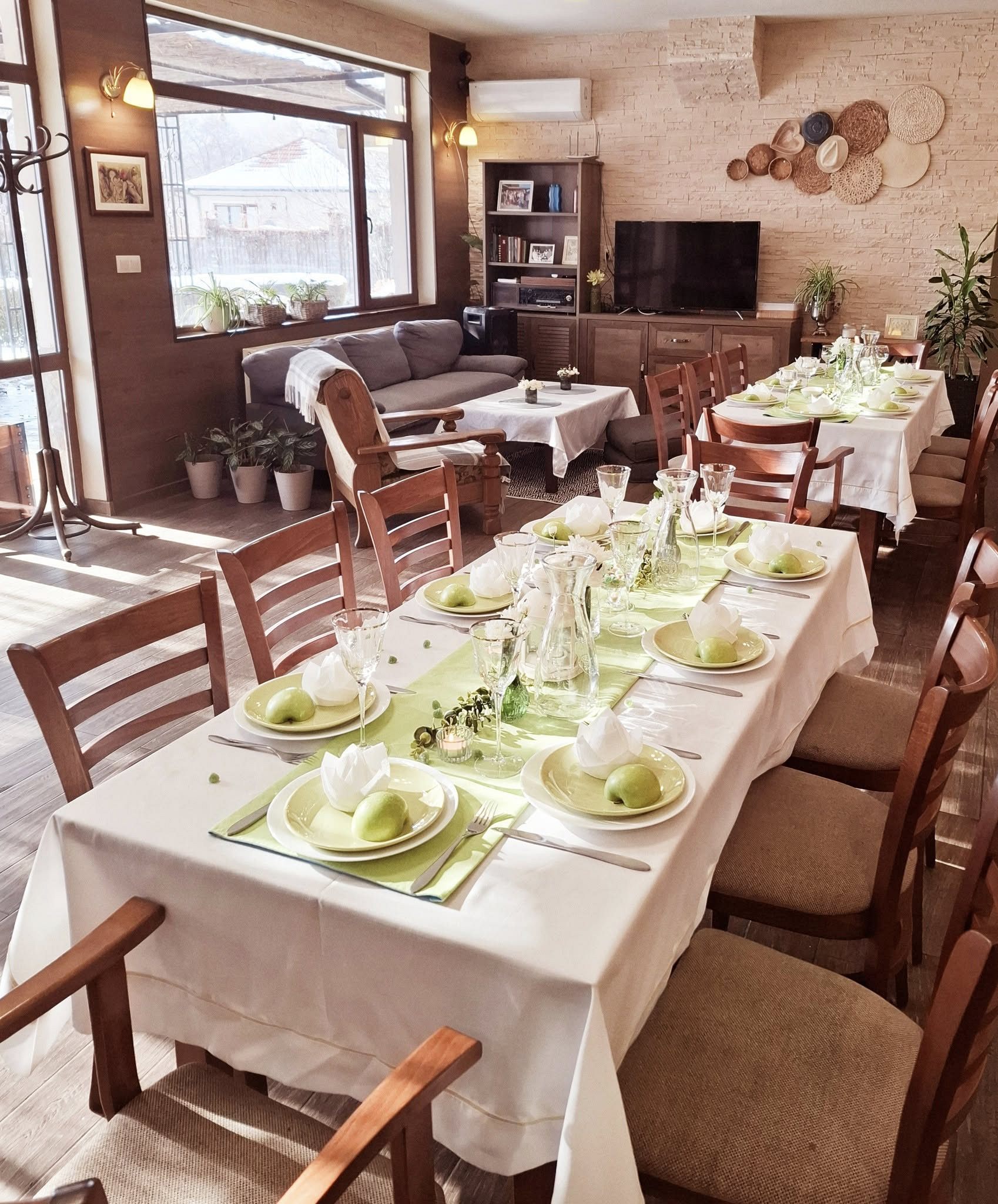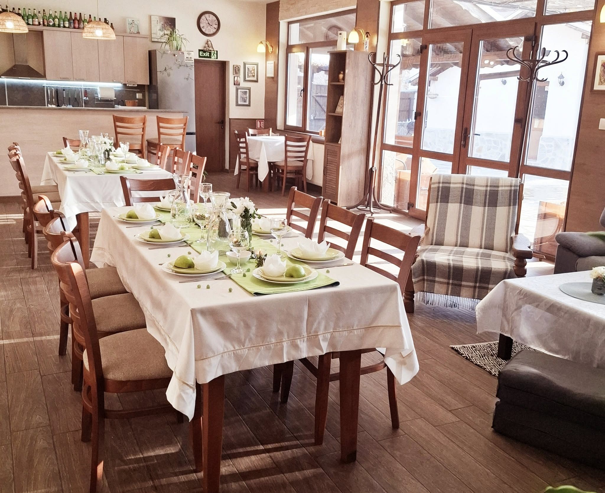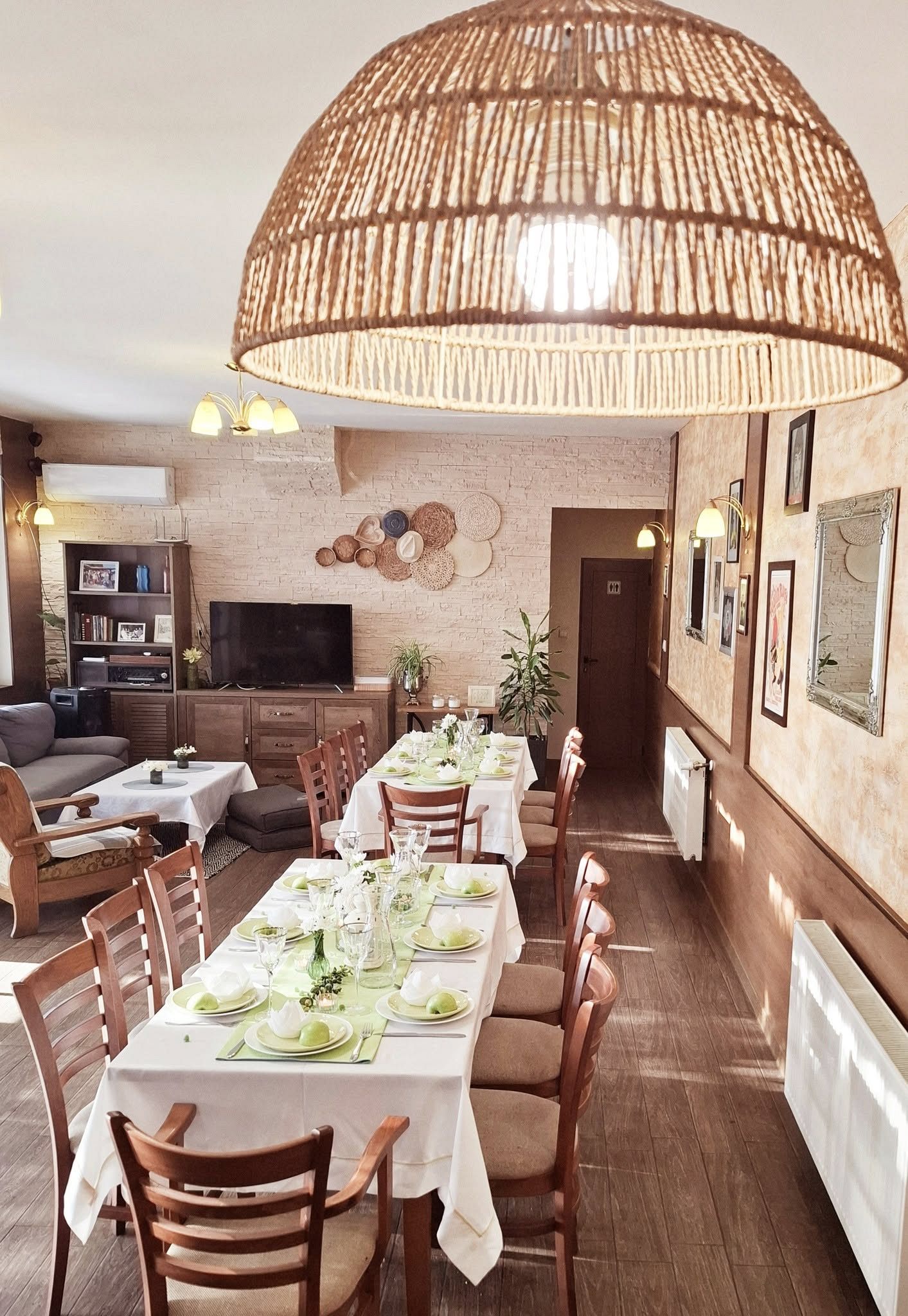 На разположение на всички гости са голяма трапезария с 30 места, напълно оборудван кухненски бокс и уютен кът с мека мебел, телевизор, музикална уредба с безжични микрофони.