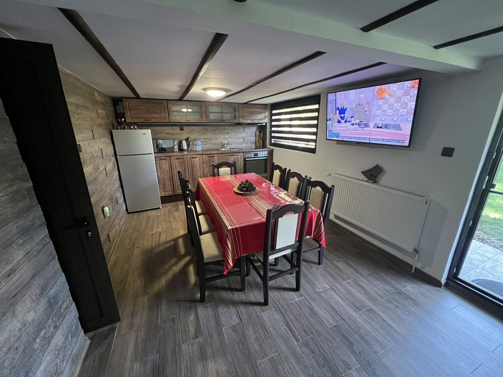 Вилата е двуетажна, като на първия етаж се намира механа-барбекю с голяма маса, телевизор, барбекю-зона и напълно оборудвана кухня. На етажа има също една двойна стая и санитарен възел с баня и тоалетна.