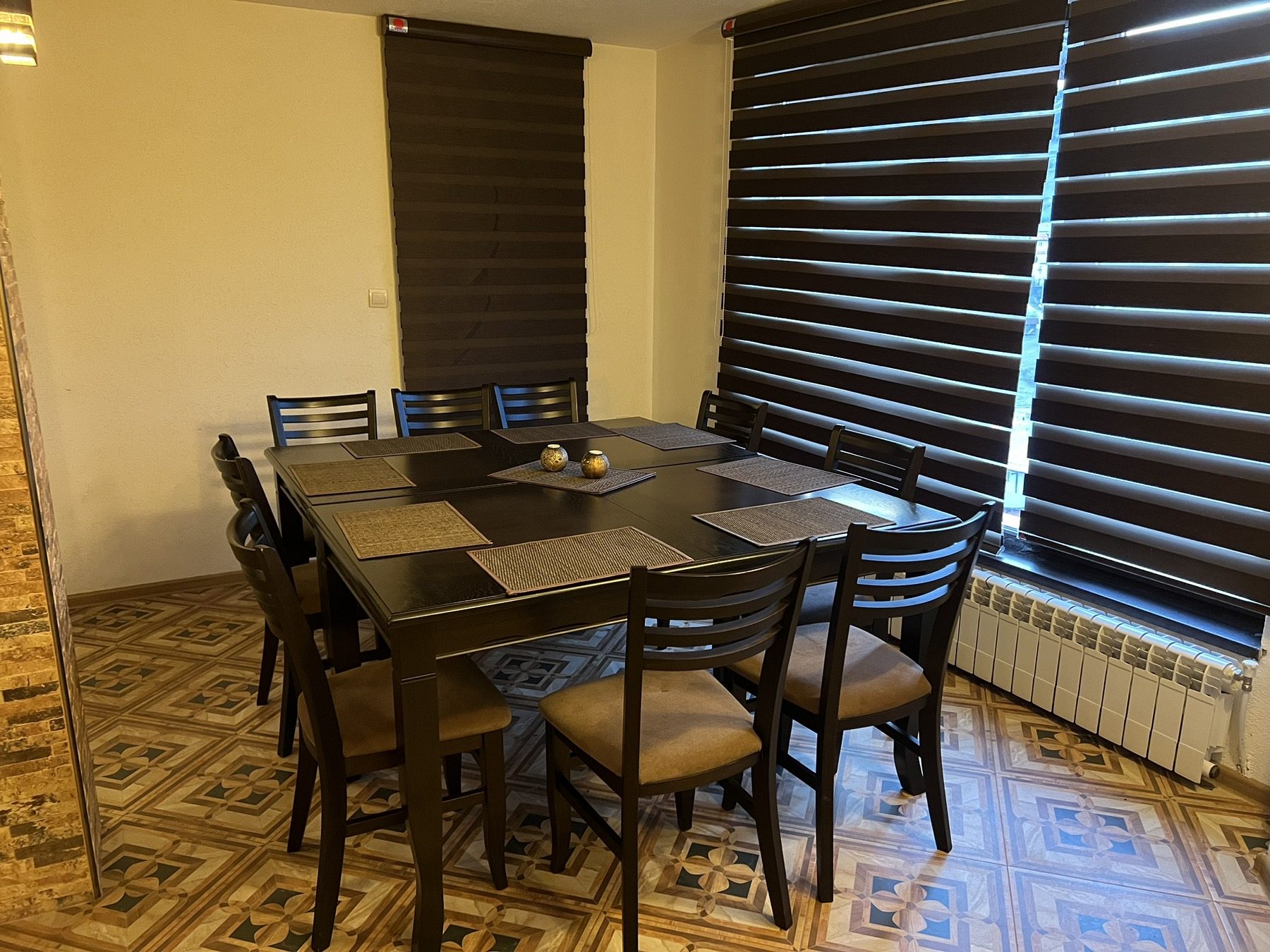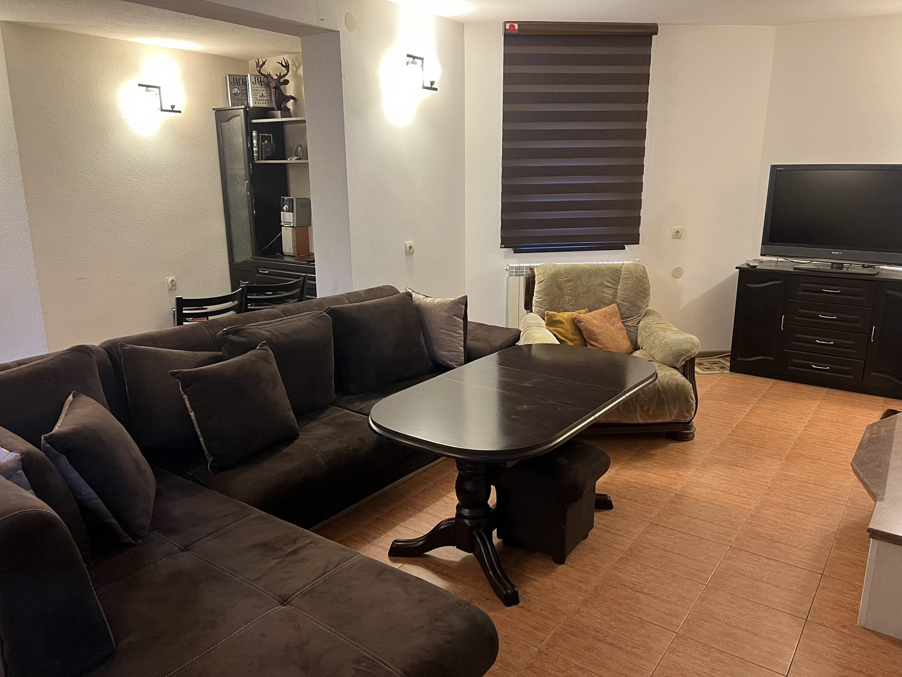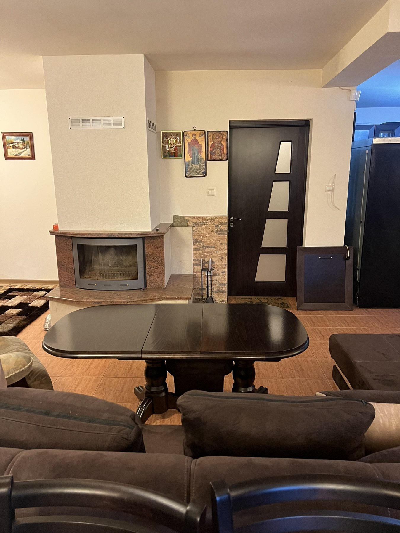 На ваше разположение са: уютна трапезария с камина, кът с мека мебел, телевизор и тонколона с микрофони; напълно обурудвана кухня.