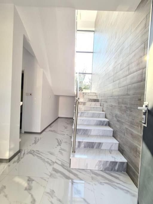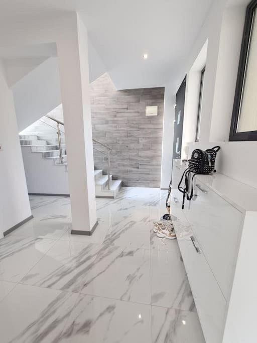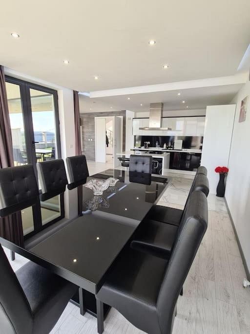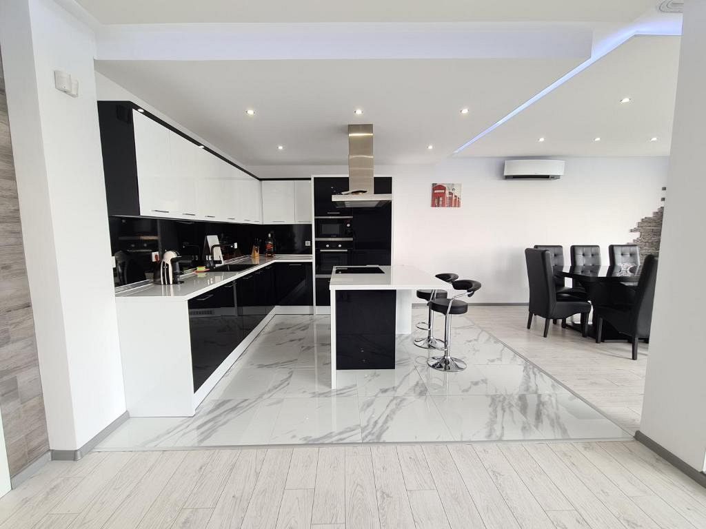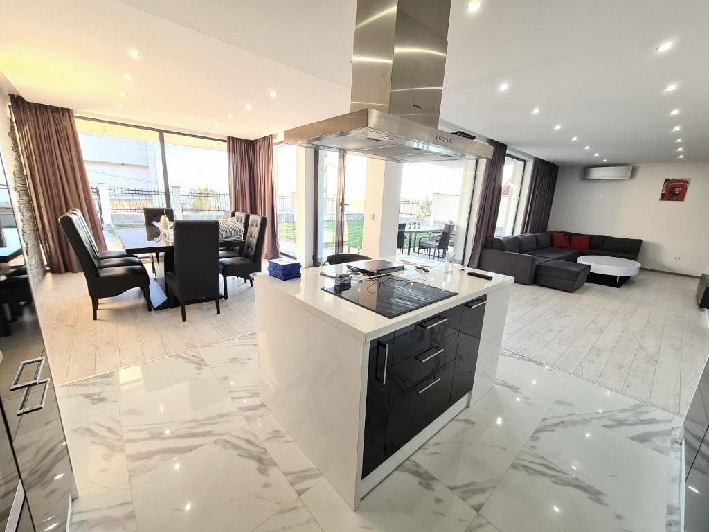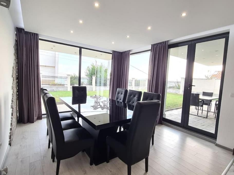 На първия етаж има модерна трапезария с кът за хранене, напълно обурудвана кухня и просторна дневна зона с мека мебел.