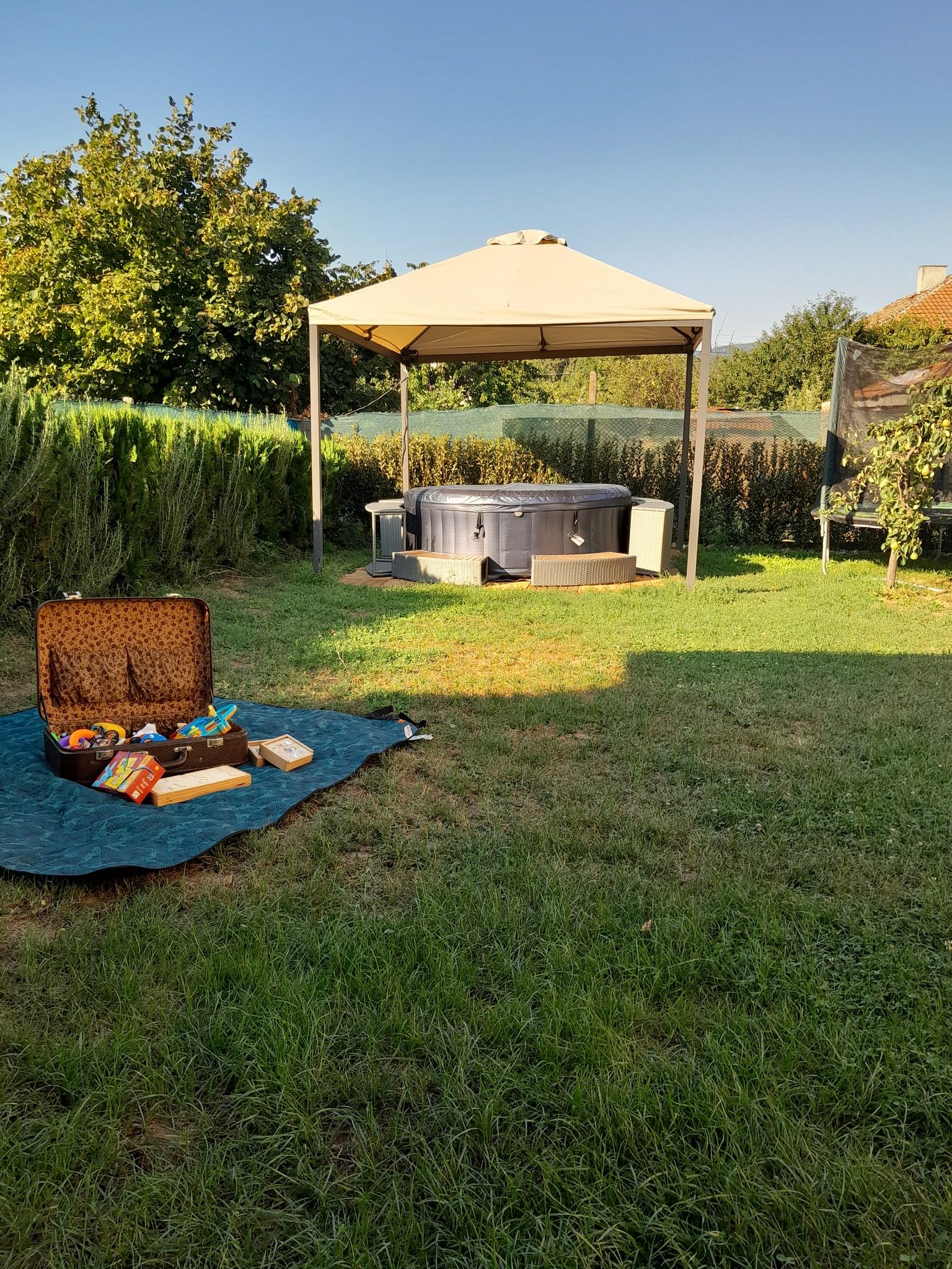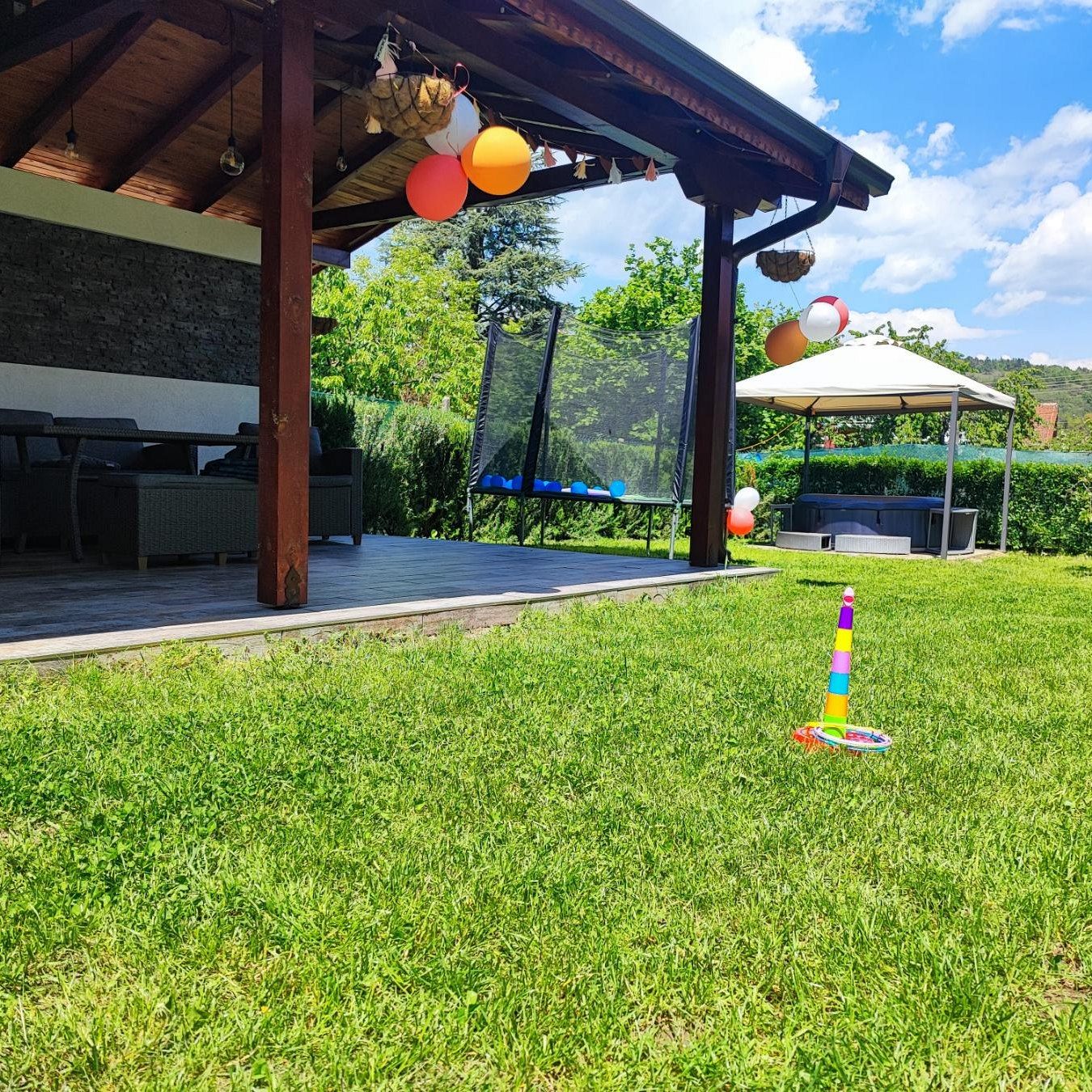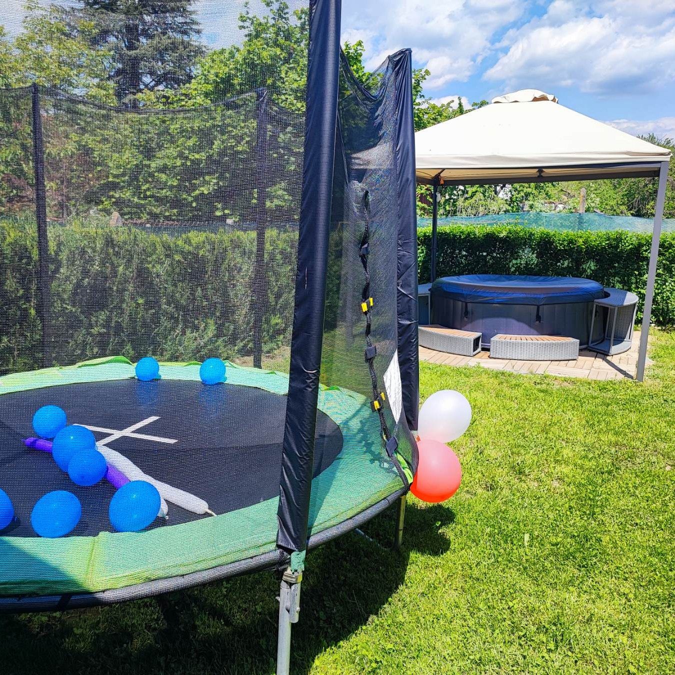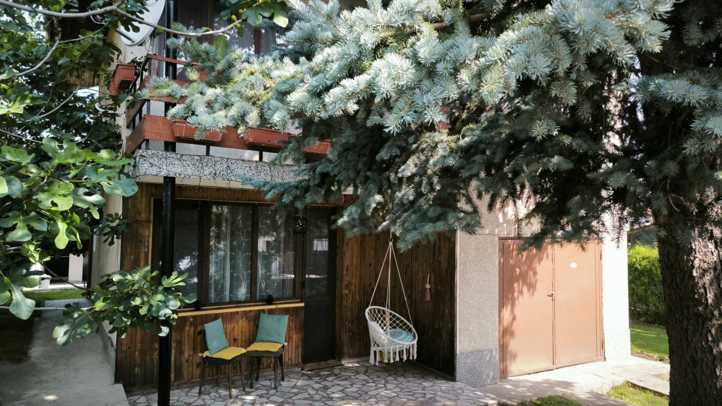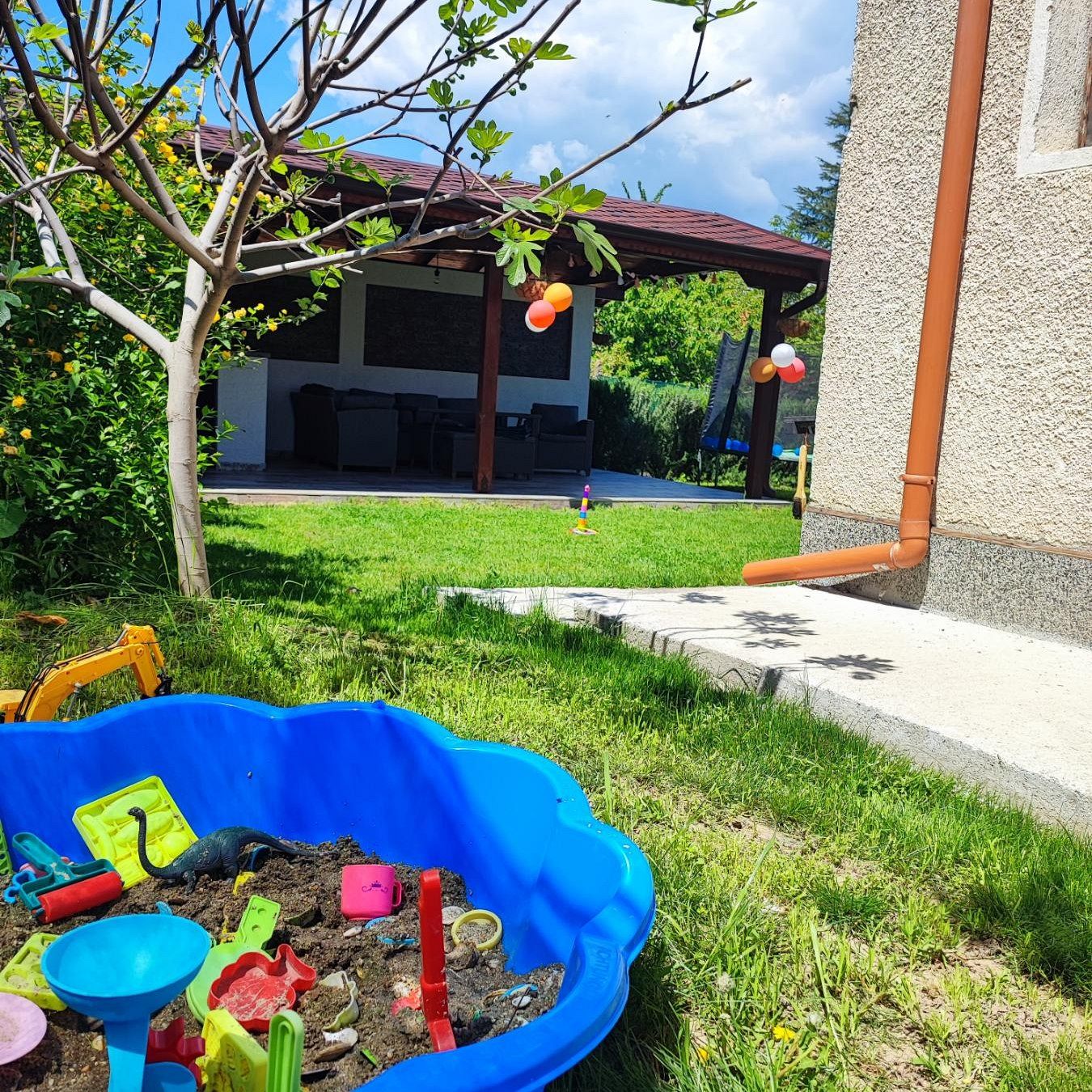 В красиво озеленения двор на ваше разположение са веранда с кът за хранене и барбекю - идеално място за дълги следобеди на сянка и прекрасни моменти с близките; детки кът с батут и пясъчник за забавление на най-малките гости.