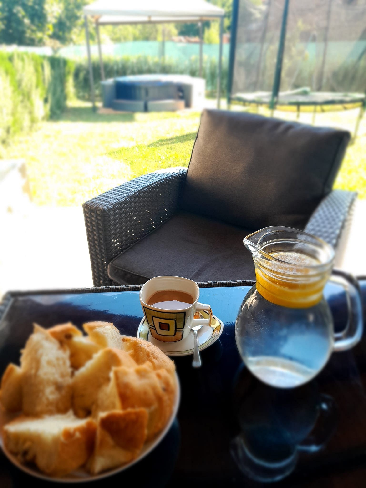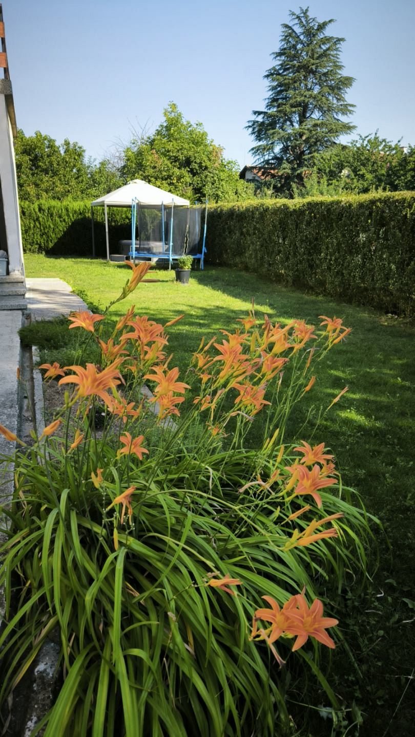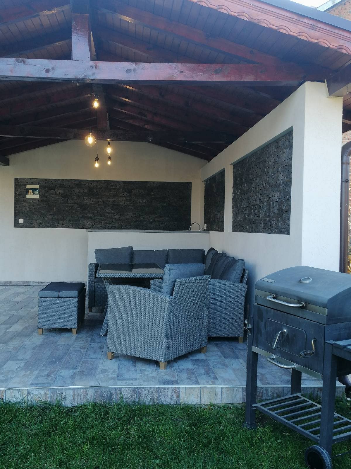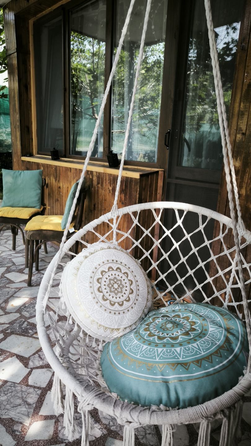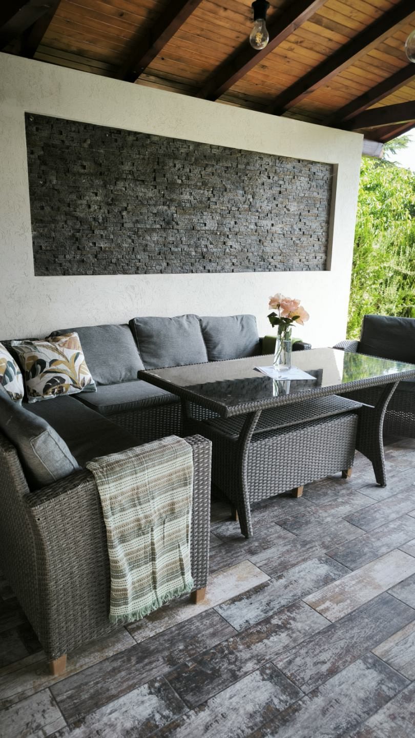 В красиво озеленения двор на ваше разположение са веранда с кът за хранене и барбекю - идеално място за дълги следобеди на сянка и прекрасни моменти с близките; детки кът с батут и пясъчник за забавление на най-малките гости.