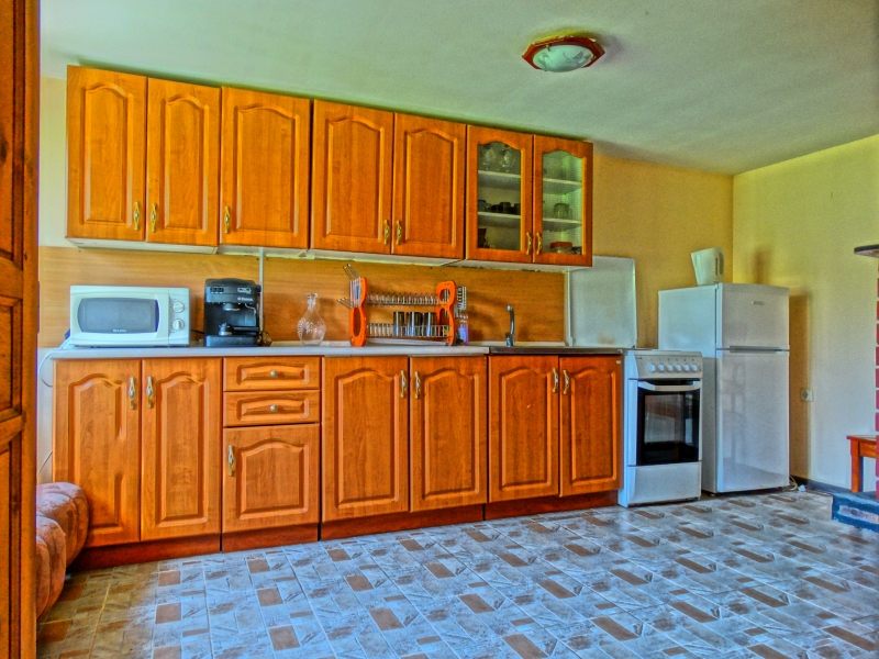 - А другата постройка разполага с три двойни стаи с допълнителни разтегателни дивани и легло, както и напълно оборудвана кухня с камина, пещ и трапезария.