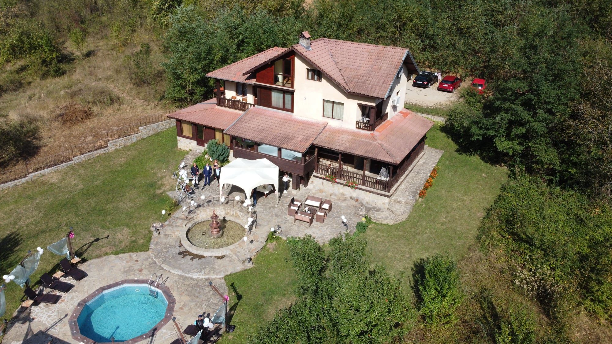 Дворът е много голям - има широка веранда, барбекю, джага, волейболно игрище, детски кът, басейн с шезлоги и голям паркинг за автомобилите на гостите.