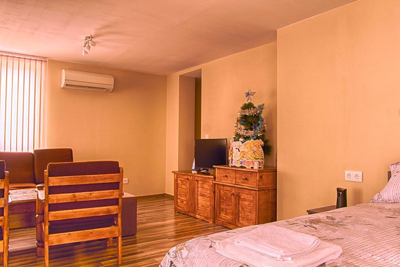 * 1 етаж - Един просторен апартамент с две стаи. В едната стая има голяма спалня с трапезария за до 5 човека, телевизор и разтегателен диван, а в другата е кухненският бокс, оборудван с всички необходими домакински уреди (кафемашина с мляно кафе). В апартамента има климатик.
