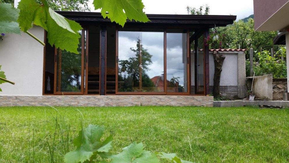 В отделна постройка, в затревения двора, има закрито барбекю със скара и мивка. Плъзгащите остъклени стени позволяват то да може да се ползва целогодишно.