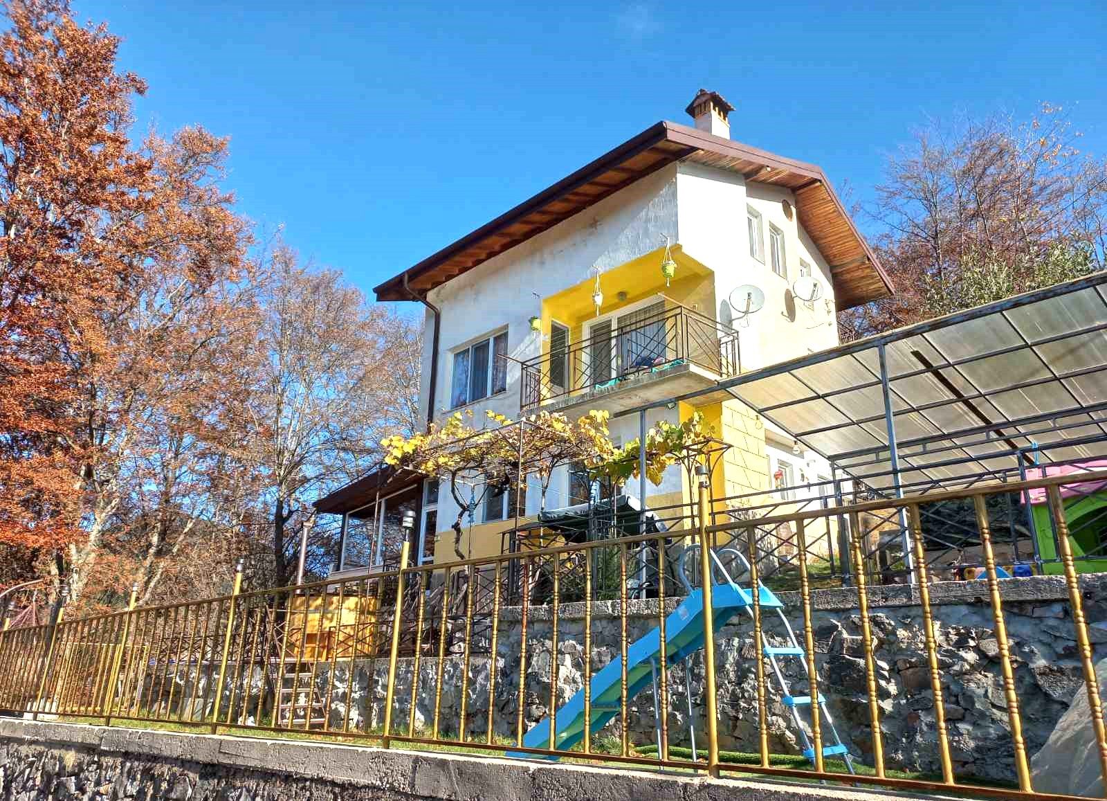 Във външната част на къщата предоставяме обезопасен двор със сезонен басейн, летен навес за 10 човека с 2 барбекюта на дървени въглища, целогодишно джакузи за 6 човека, детски кът и външна тоалетна. За Вашата пълноценна и разнообразна почивка сме предвидили освен релакс зоните и такива за спорт - тенис маса, билярд и джаги.
