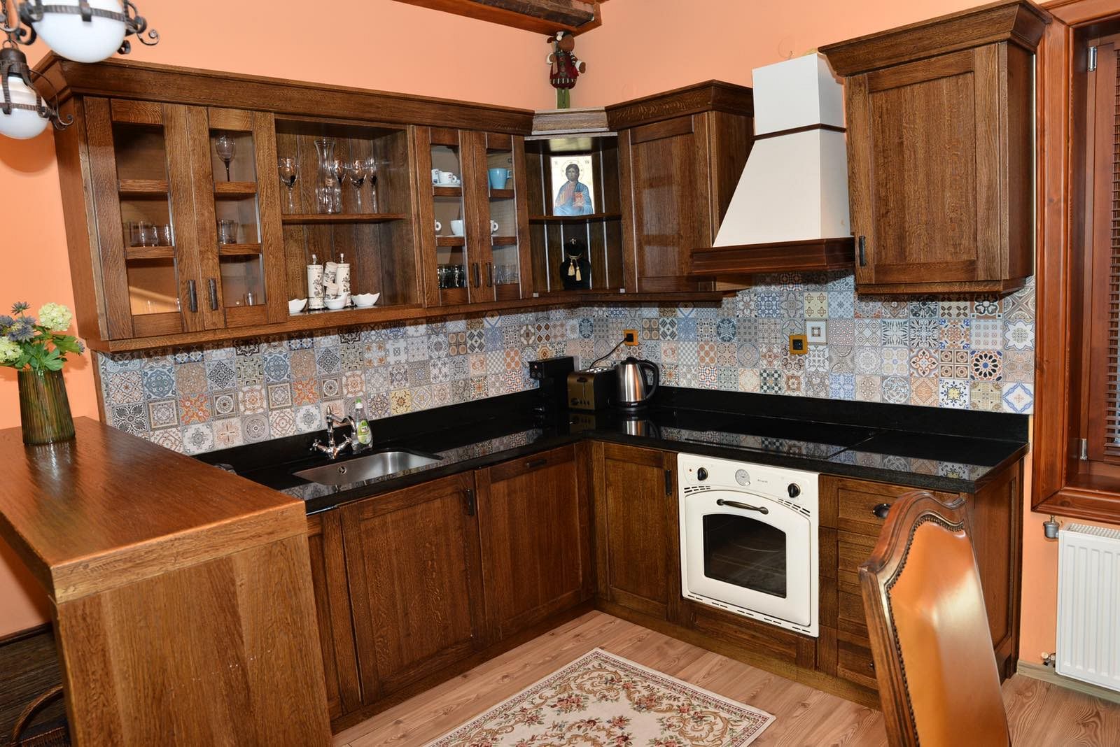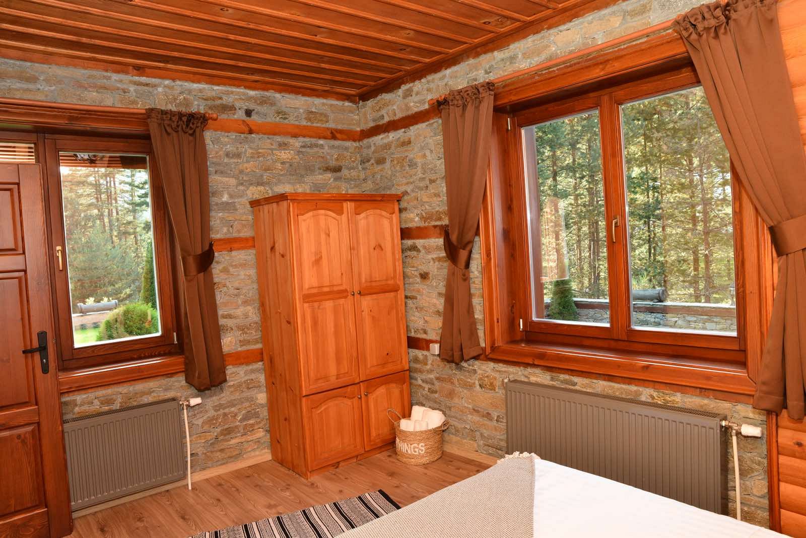 Къщата е изградена изцяло от екологични материали, като преобладават естественият камък и дървото. Разполагаме с просторна всекидневна с камина, трапезария и напълно оборудвана кухня - с всички необходими електроуреди, включително съдомиялна, фризер, кафе-машина.