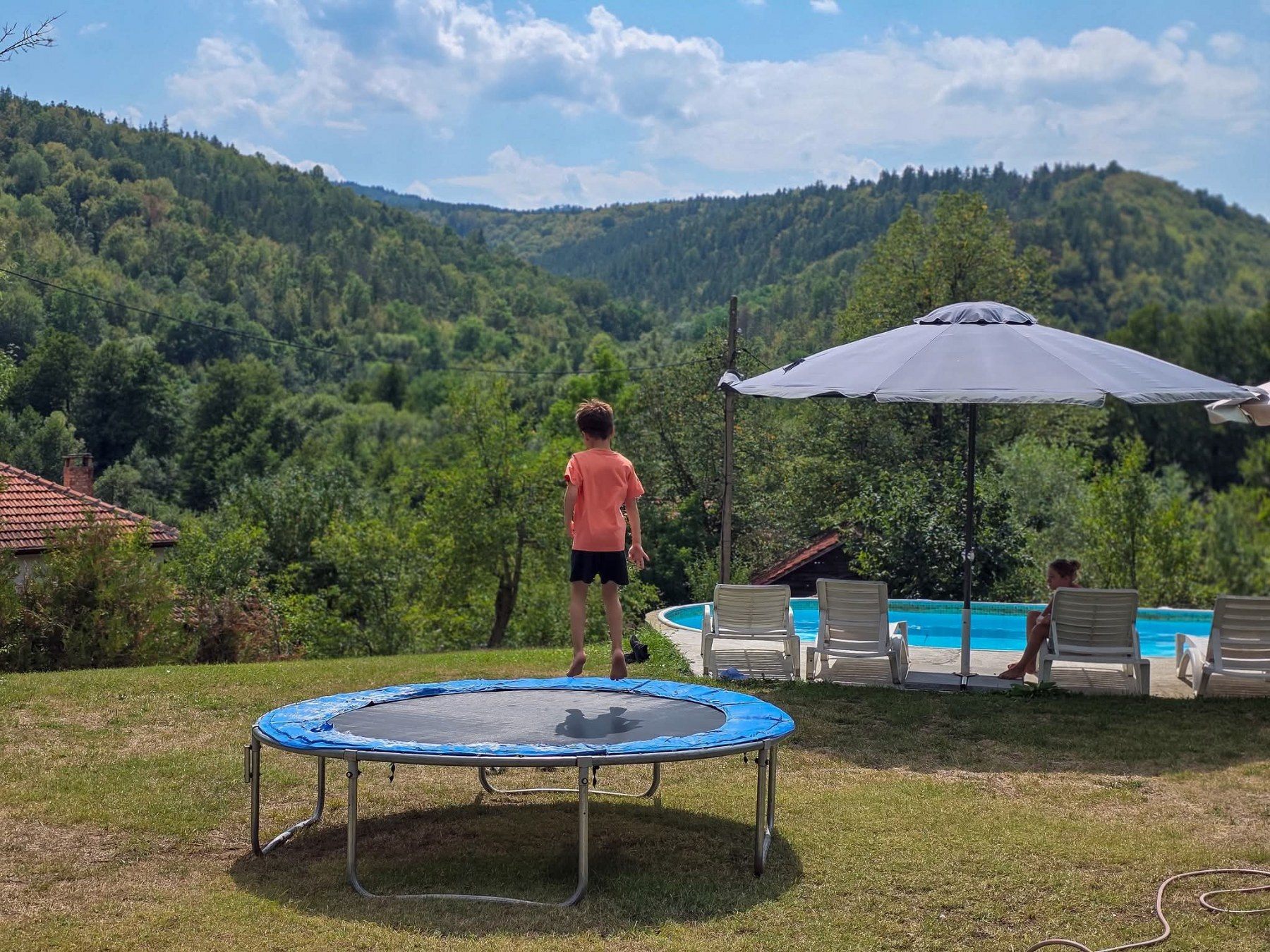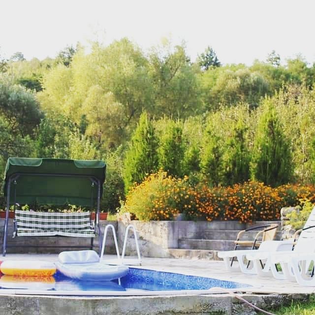 Дворът е озеленен, с открит басейн за топлите месеци и целогодишно джакузи за 4-6 човека.