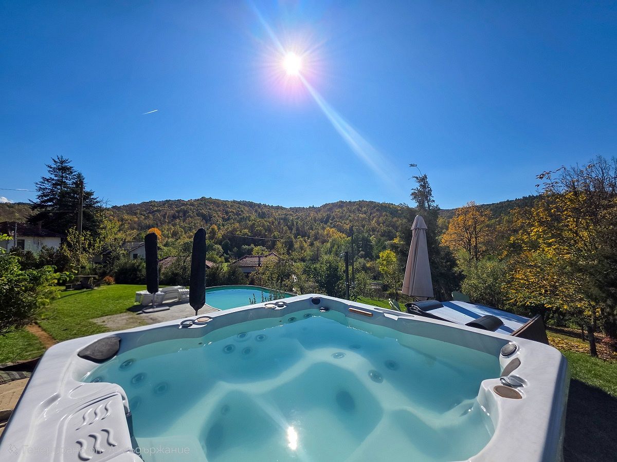 Дворът е озеленен, с открит басейн за топлите месеци и целогодишно джакузи за 4-6 човека.