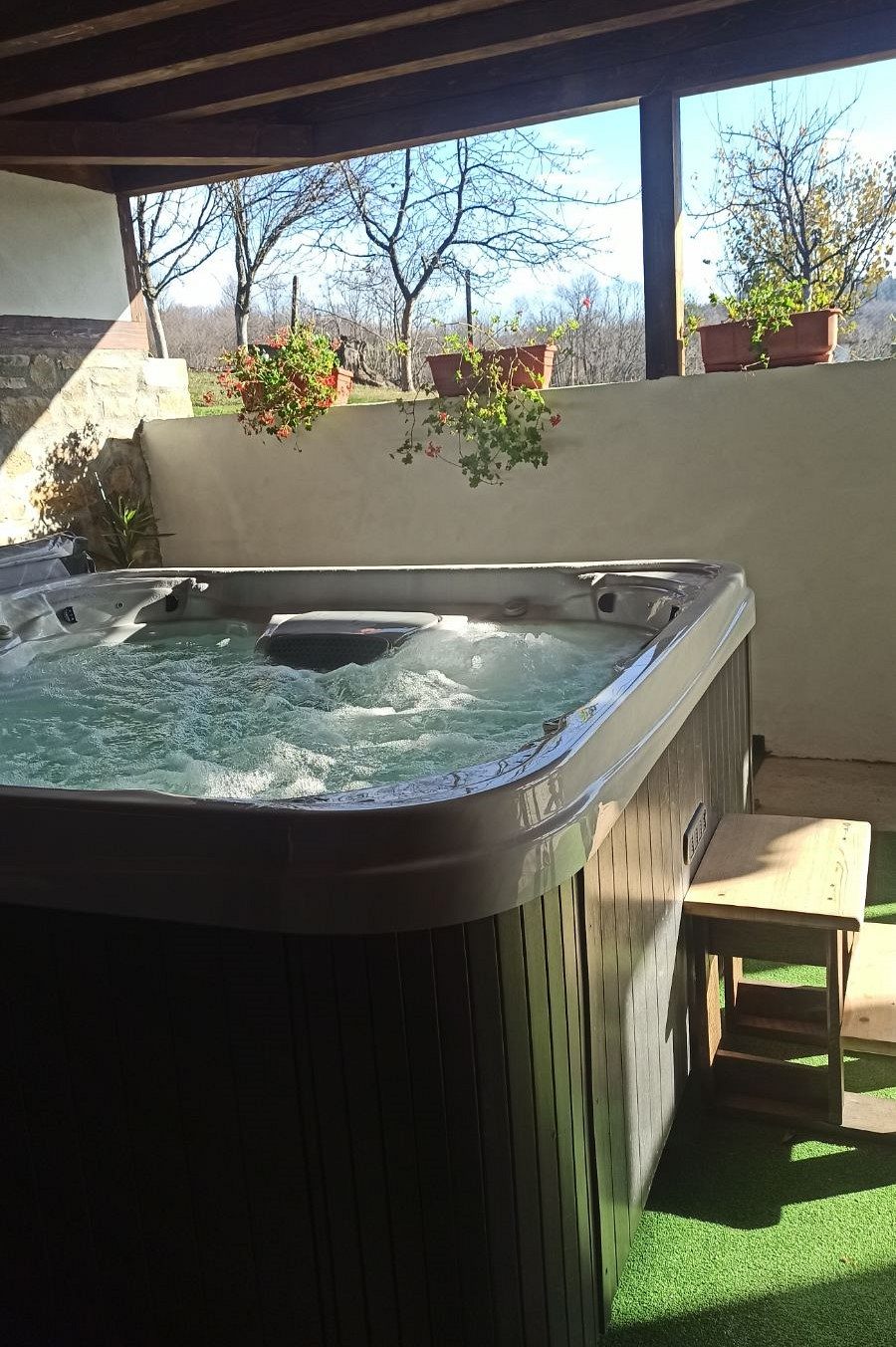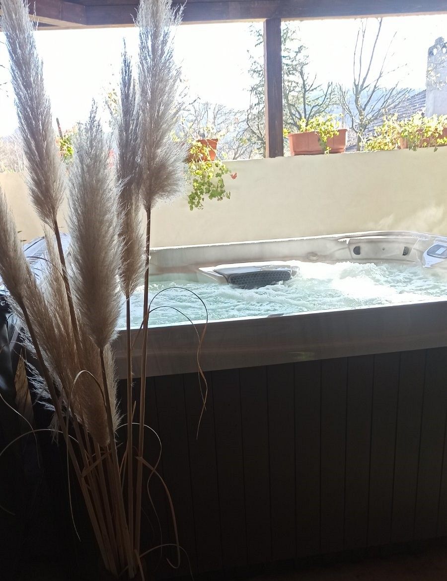 В обширната озеленена градината има кът за релакс, целогодишно джакузи, детски кът с люлки, батут и пързалка. Дворът е обезопасен, с налични паркоместа.