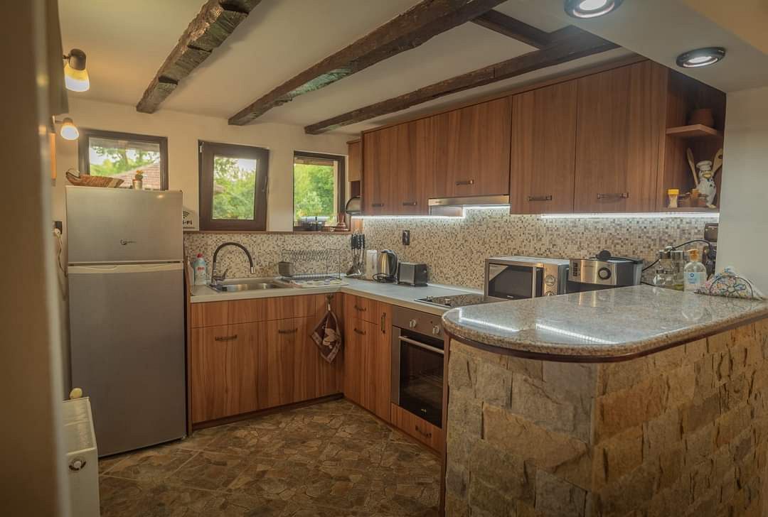 Къщата предлага добре уредена и оборудвана кухня, дневна с камина и трапезария.